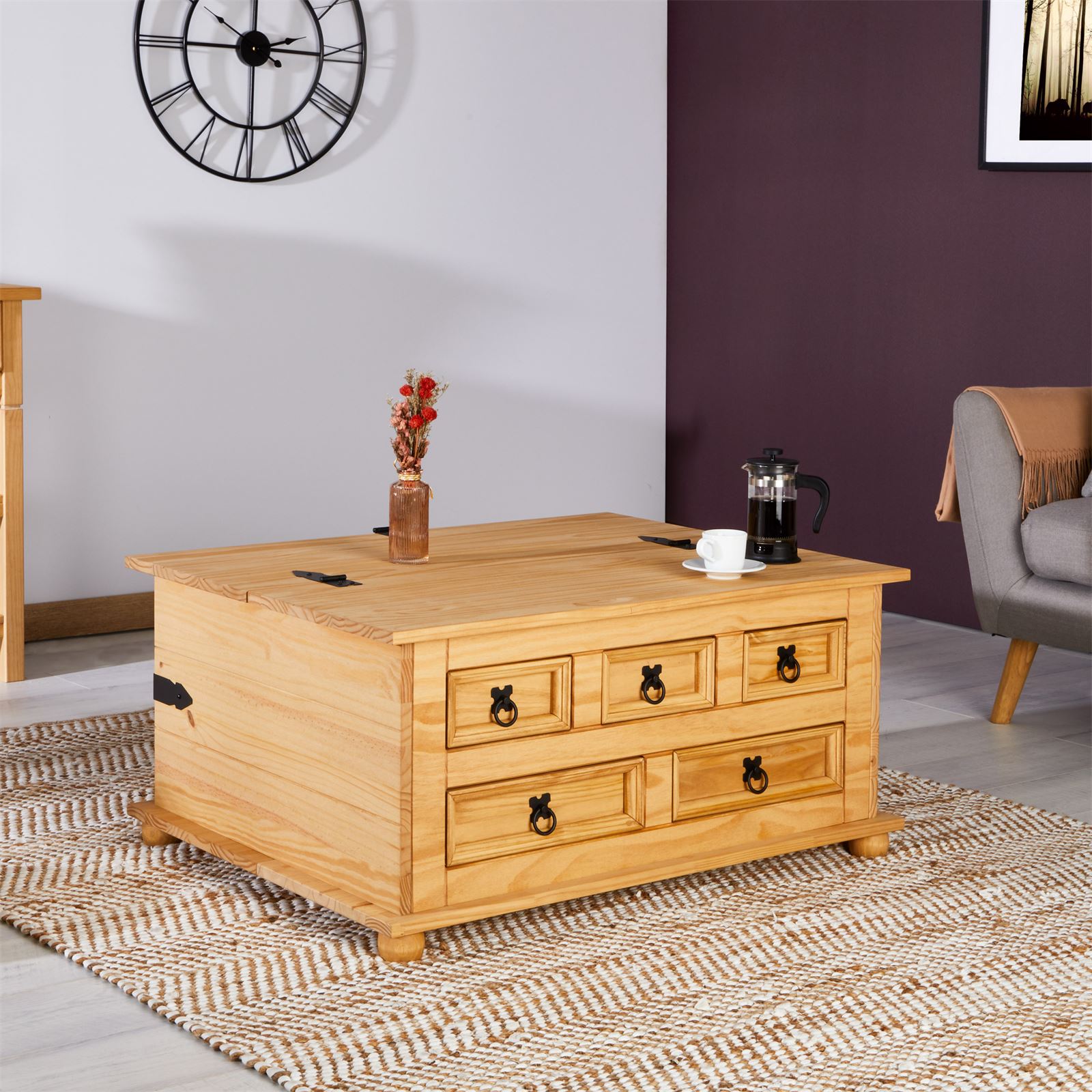 | Plus produit | Cette table basse est fabriquée en pin massif à la finition teintée et cirée, la madrure du bois reste donc visible ; les poignées et les ferrures sont en métal noir |