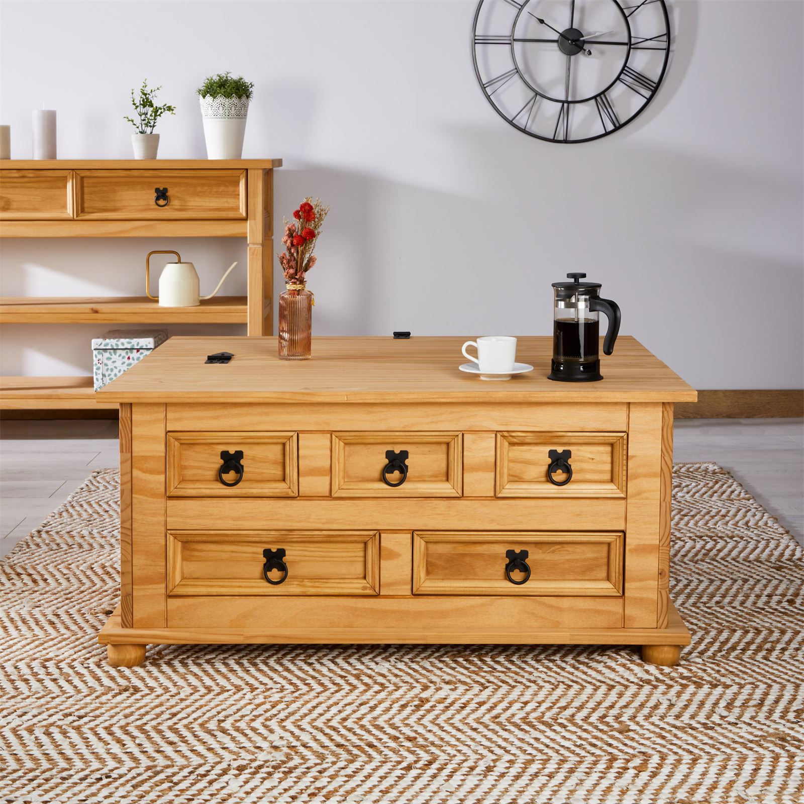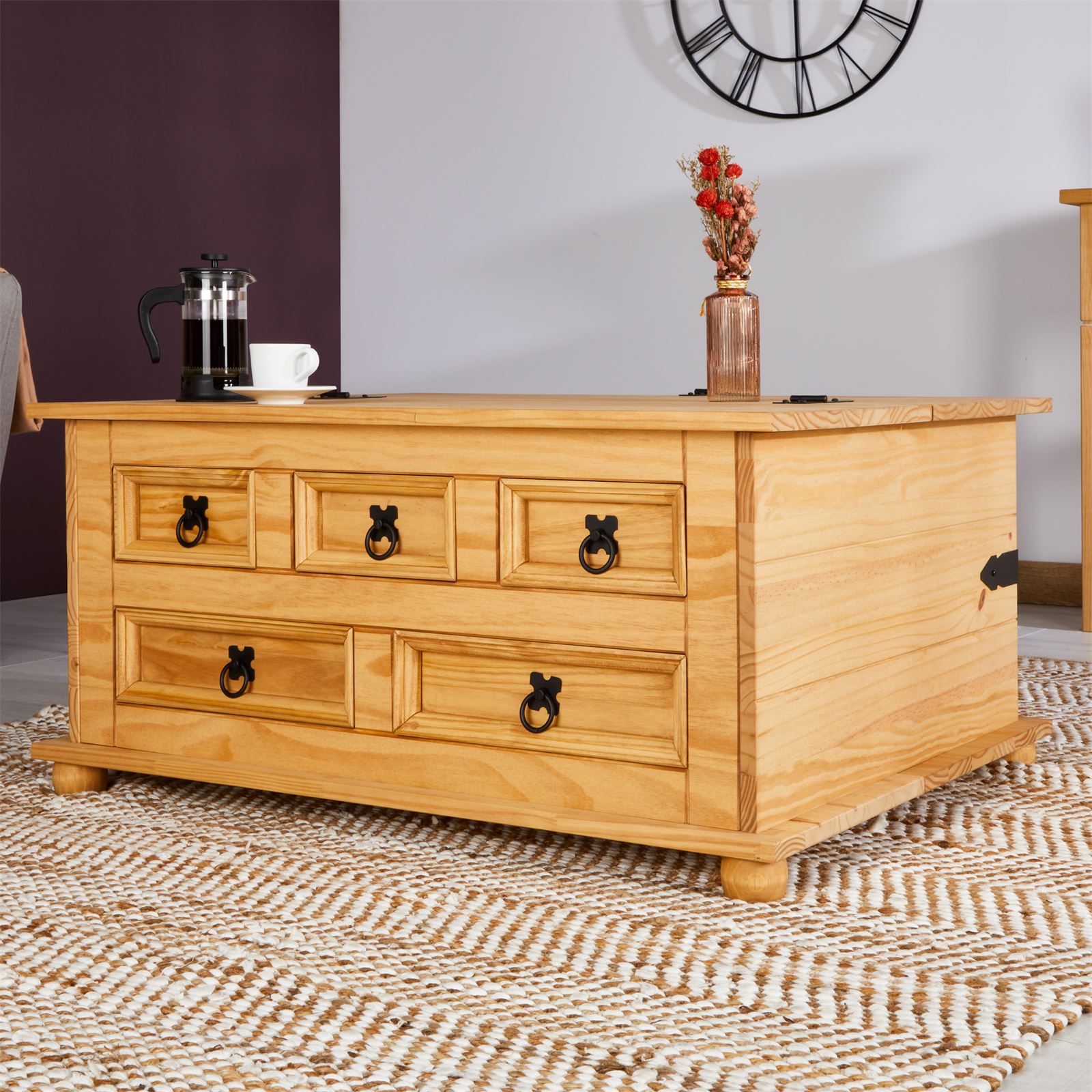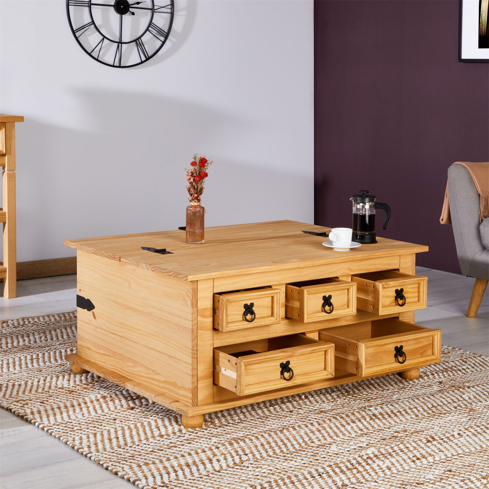 | Libellé | Table basse de salon TEQUILA coffre malle de rangement rectangulaire en bois style mexicain avec 5 tiroirs en pin massif teinté/ciré |