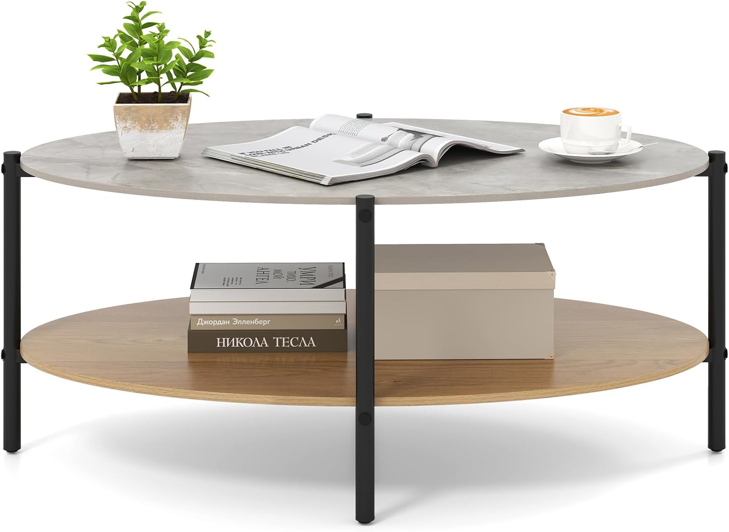 Table Basse Ovale - 2 Niveaux, Cadre en Métal, Design Compact, 105 x 65 x 43 cm