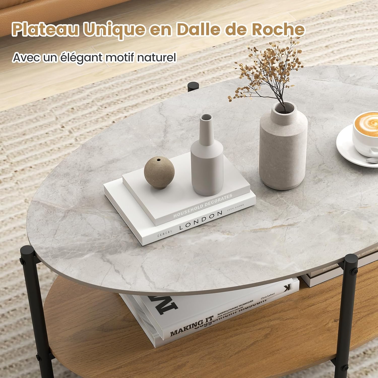 Apportez une touche de raffinement à votre intérieur avec cette élégante table d’appoint ovale, dotée d’un plateau en pierre original qui incarne l’élégance intemporelle. Sa structure métallique élancée ajoute une note de luxe, faisant de cette table une pièce maîtresse qui dure dans le temps. Son design ingénieux à 2 niveaux offre un grand espace de rangement pour vos livres, ordinateur, tasses et autres objets, gardant votre intérieur bien ordonné. Profitez d’une stabilité assurée grâce au cadre en métal renforcé, aux traverses solides et aux fixations sécurisées. Facile à entretenir grâce à sa surface lisse, elle assure sécurité et durabilité grâce à ses bords arrondis et à ses patins réglables, pour un meuble aussi fonctionnel qu’esthétique.