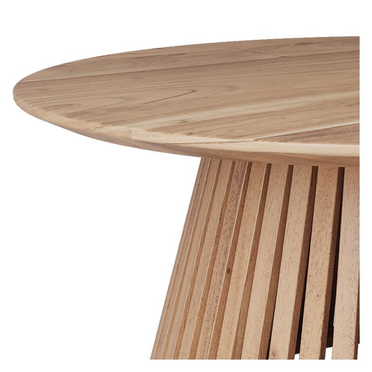 Le bois d’acacia de cette table basse se distingue par ses nuances riches. Un effet légèrement blanchi adoucit sa tonalité foncée. Vous apprécierez les proportions du plateau rond aux bords biseautés. Le piètement incliné, constitué de lattes verticales, apporte du dynamisme à ce meuble élégant et original. Sa robustesse vous permettra d’en profiter durablement.