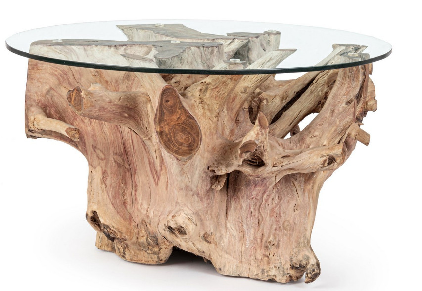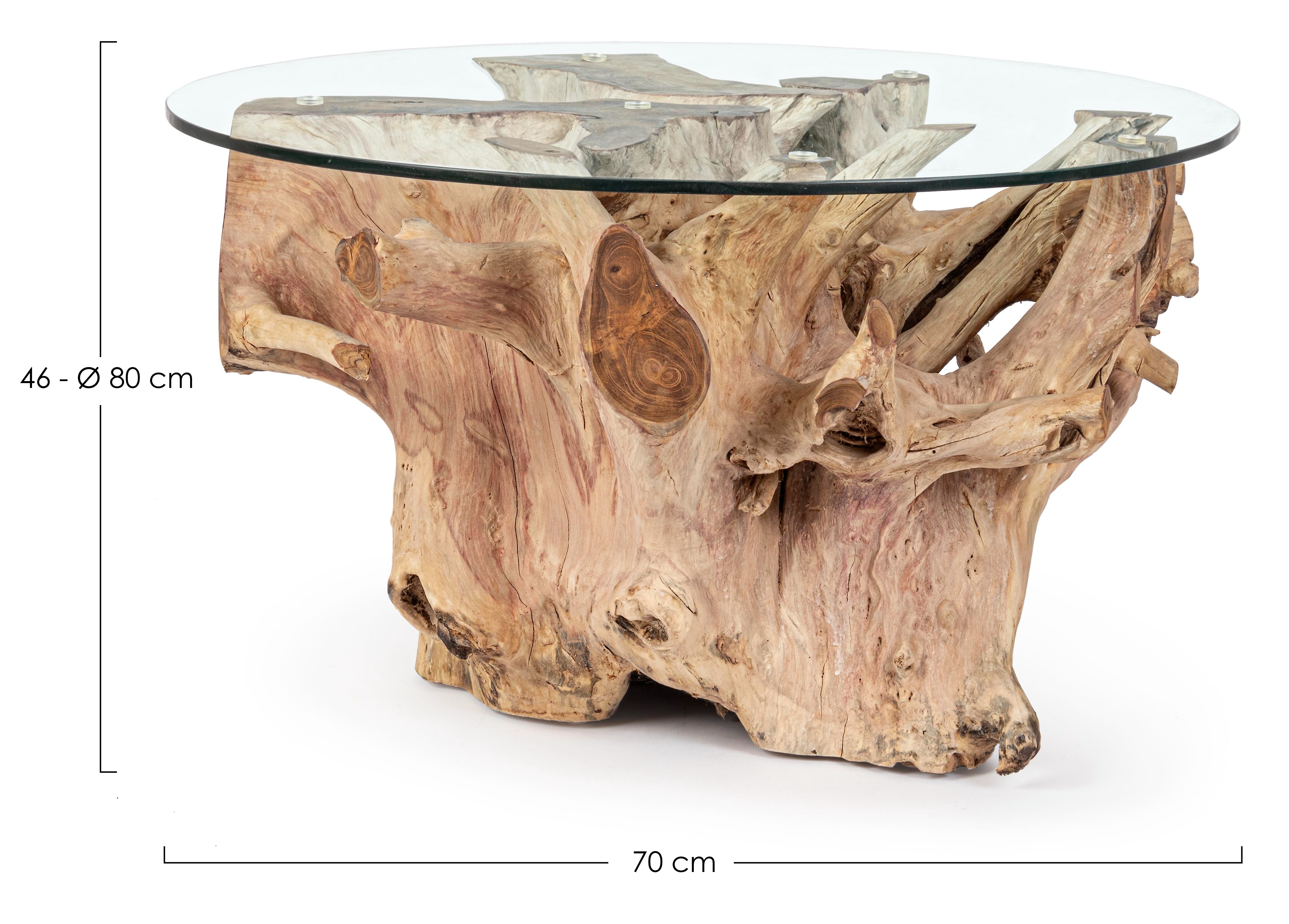 Table basse ronde racines de teck et verre trempé Zanda 80cm