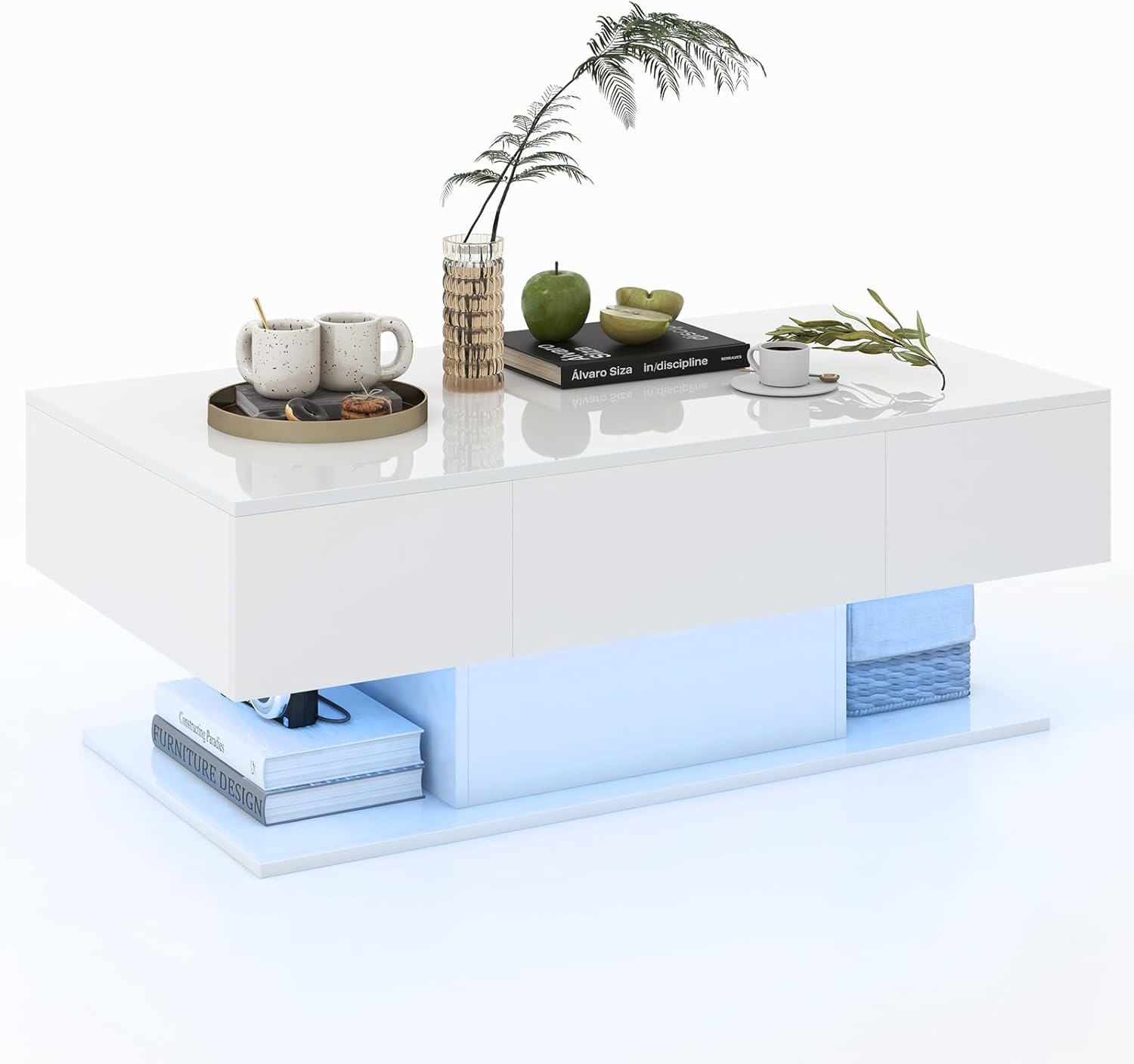 Table Basse Salon 2 Tiroirs- avec 20 Lumières LED, 22 Modes Dynamiques, Télécommande, Compartiment sous T