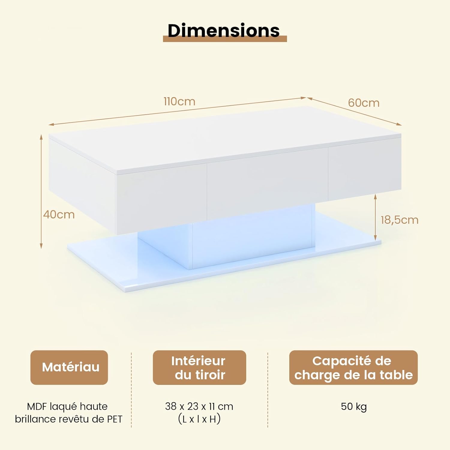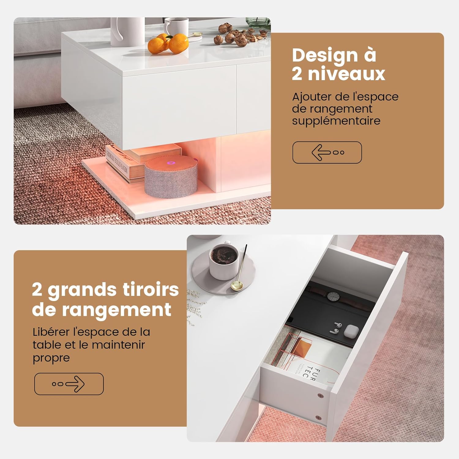 | Libellé | Table Basse Salon 2 Tiroirs- avec 20 Lumières LED, 22 Modes Dynamiques, Télécommande, Compartiment sous Table pour Salon |