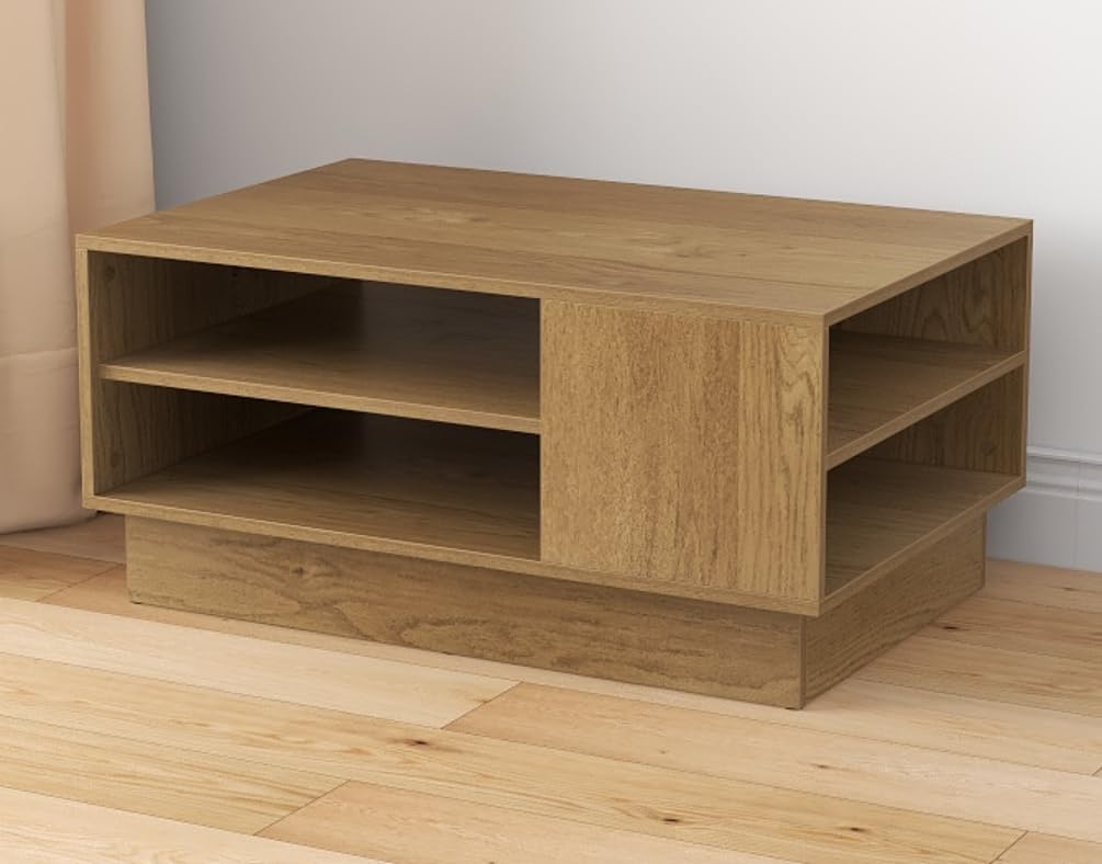 Table basse salon moderne avec étagères de rangement ouvertes, base encastrée et patins antidérapants