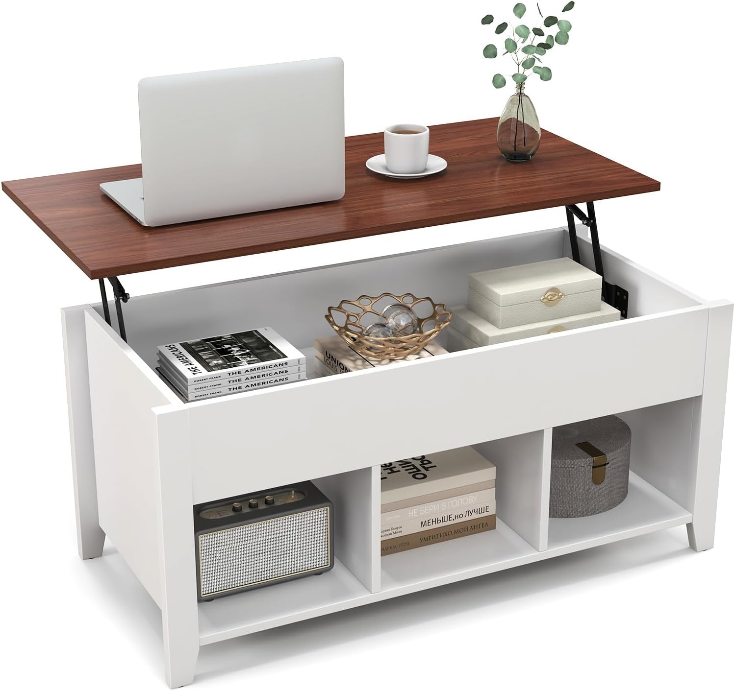 Table basse salon moderne avec plateau relevable, 3 compartiments de rangement, blanc