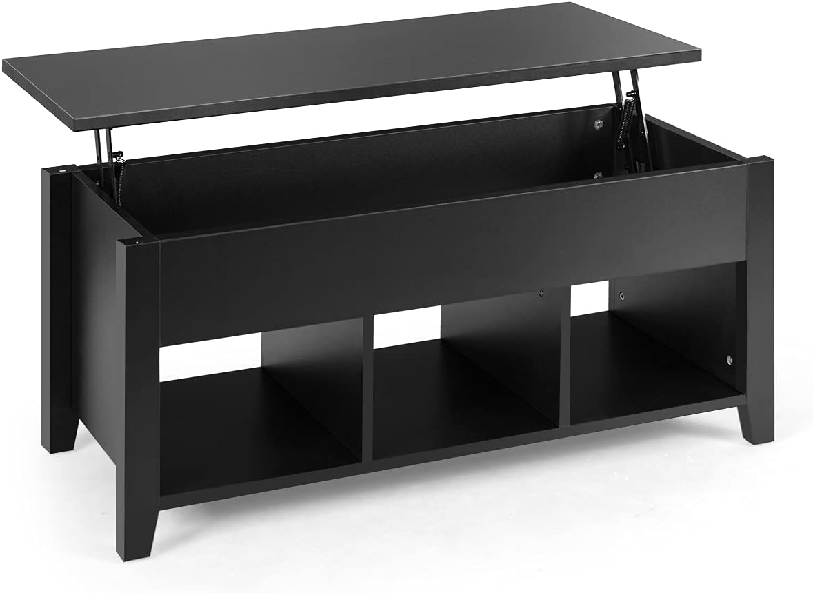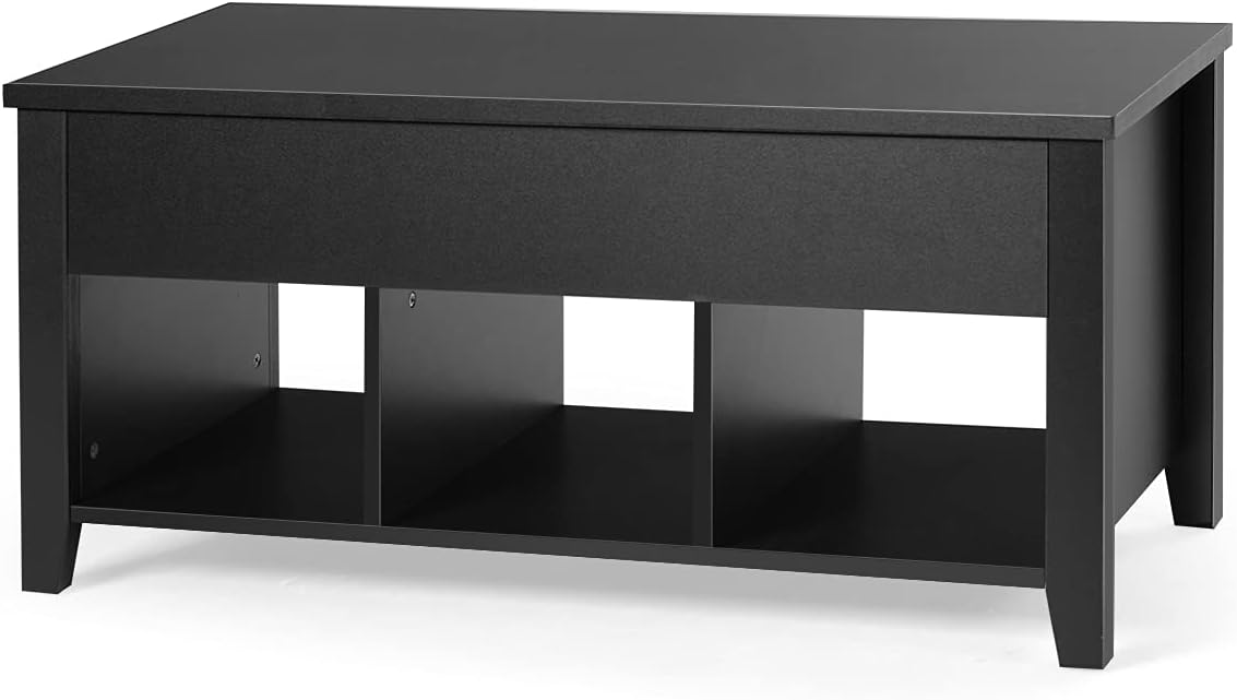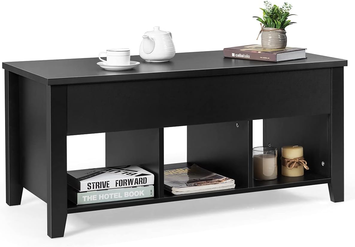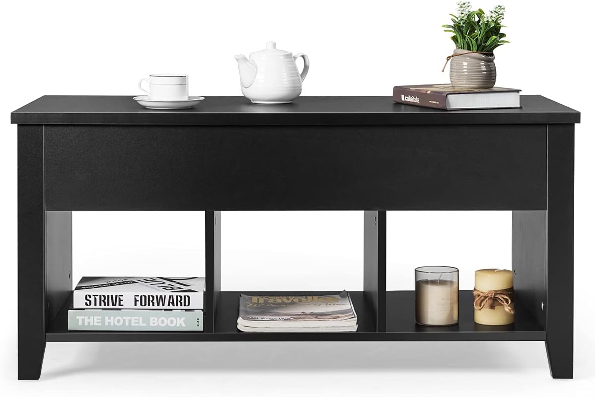 Table basse salon moderne avec plateau relevable, 3 compartiments de rangement, noir