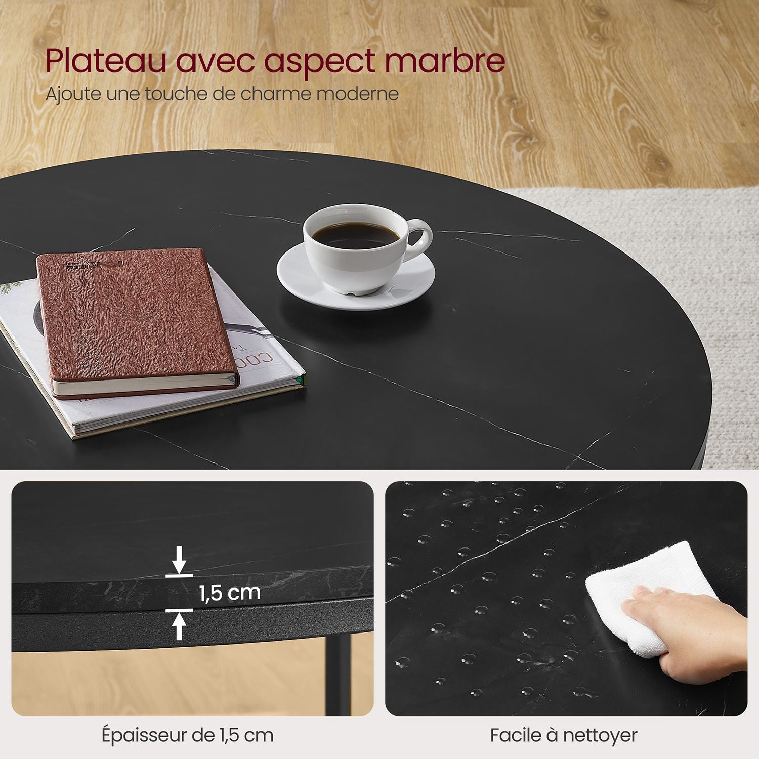 Libellé Table basse table de salon 80 x 46 cm table canapé apéro façon marbre support en verre trempé facile à assembler pour salon style moderne noir 12_000
