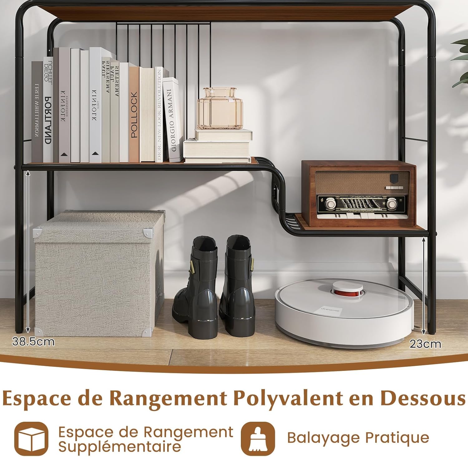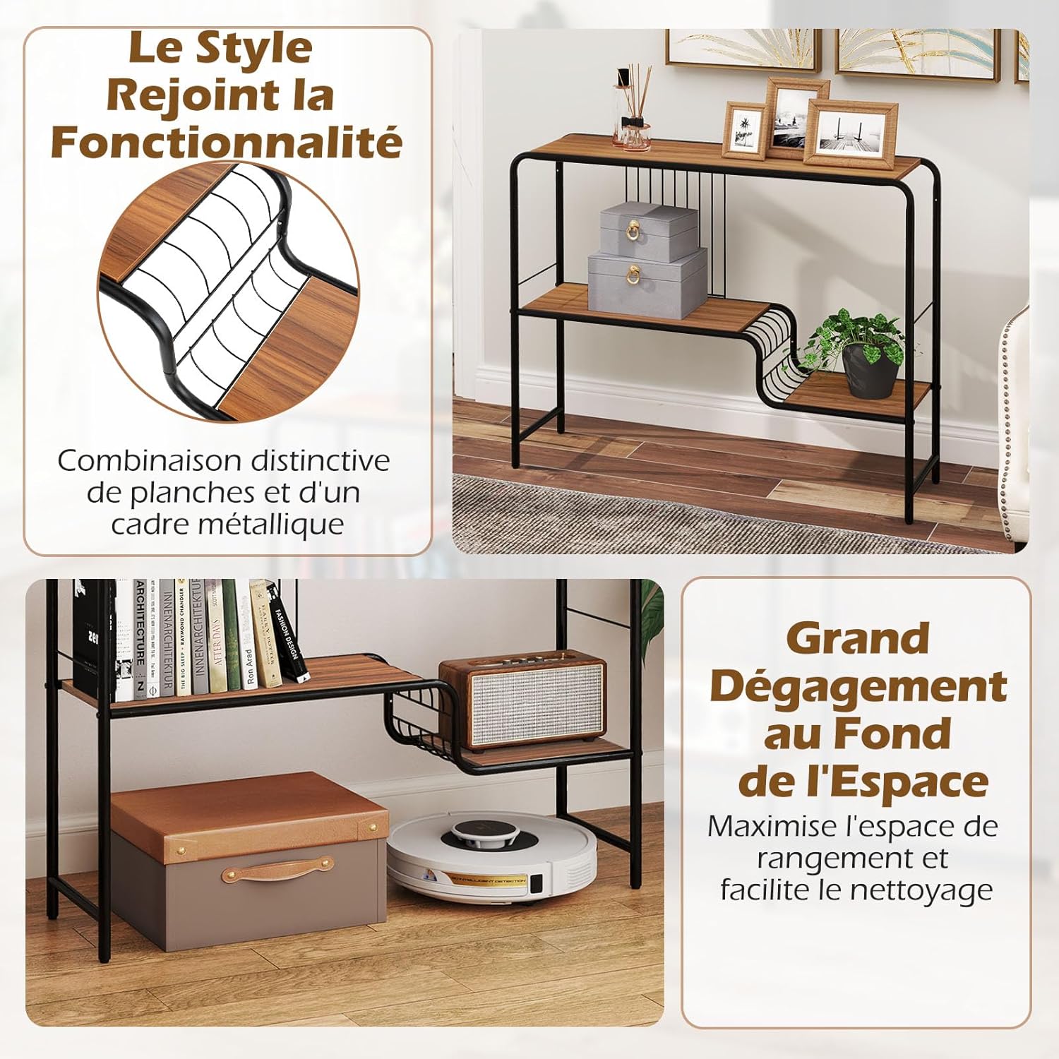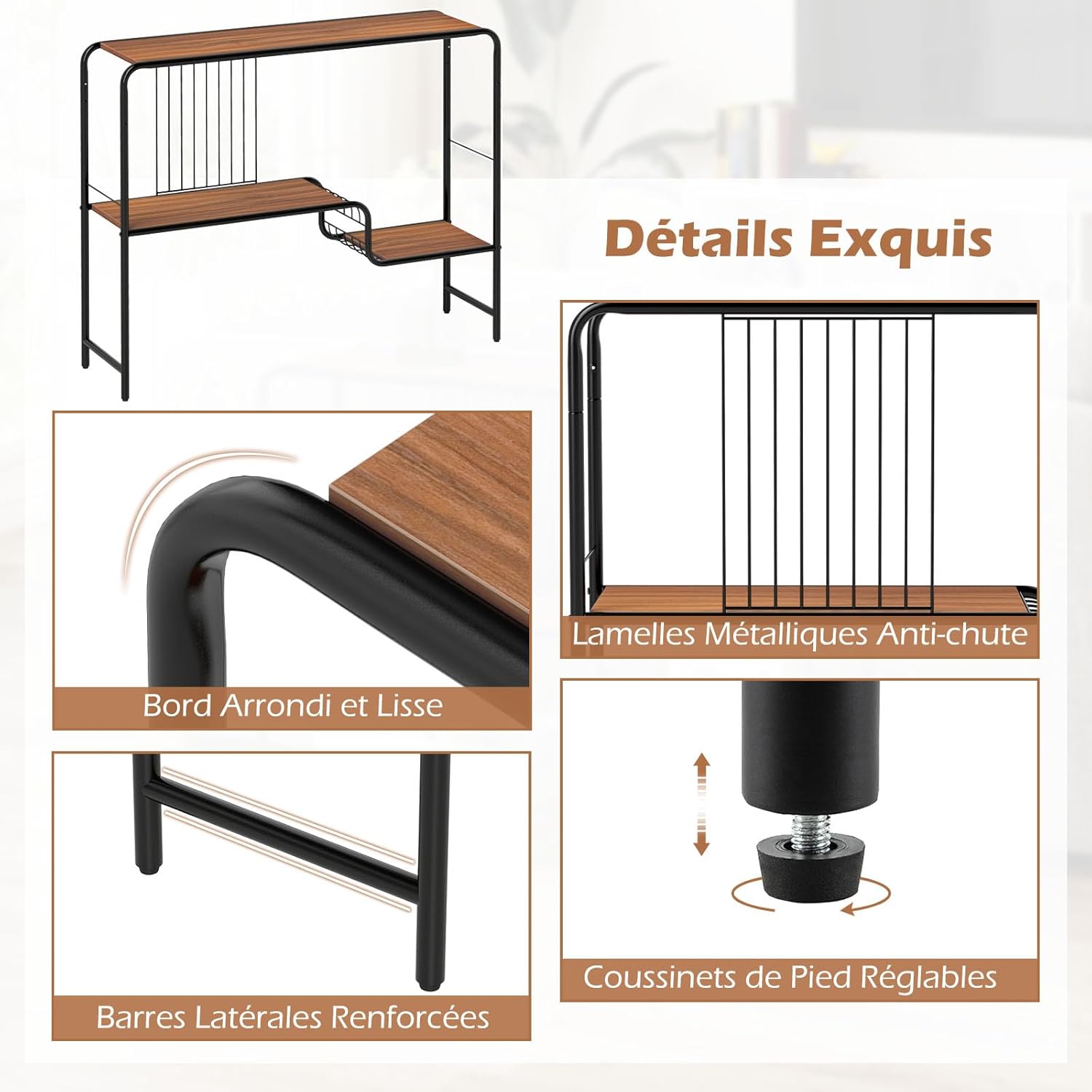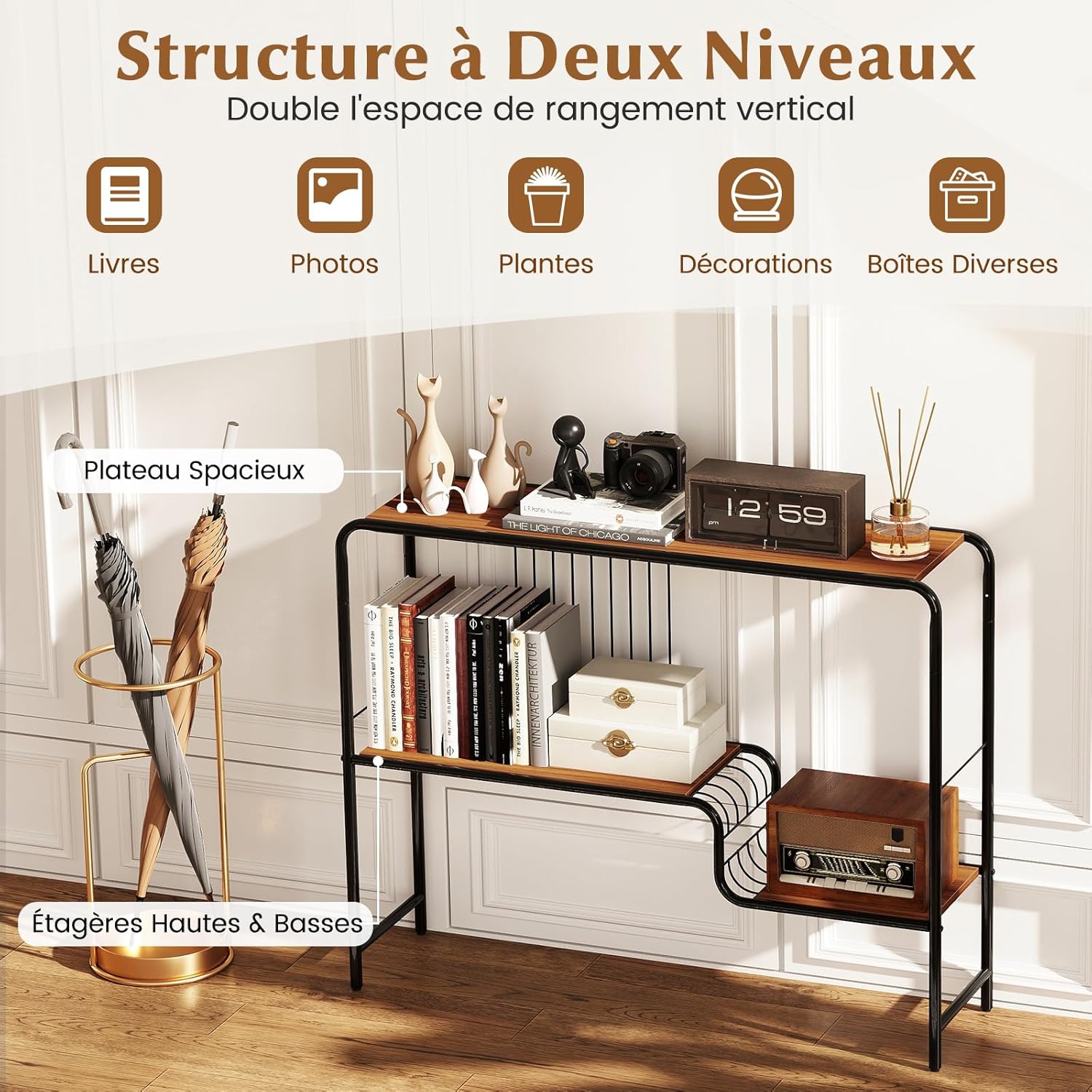 - Rangement Spacieux à 2 Niveaux — Equipée d'un plateau spacieux et d'étagères hautes et basses, la table console permet de maximiser l'espace vertical dans votre espace de vie. La structure à 2 niveaux double l'espace de rangement, offrant suffisamment de place pour les livres, les photos, les plantes, les décorations et les boîtes diverses.