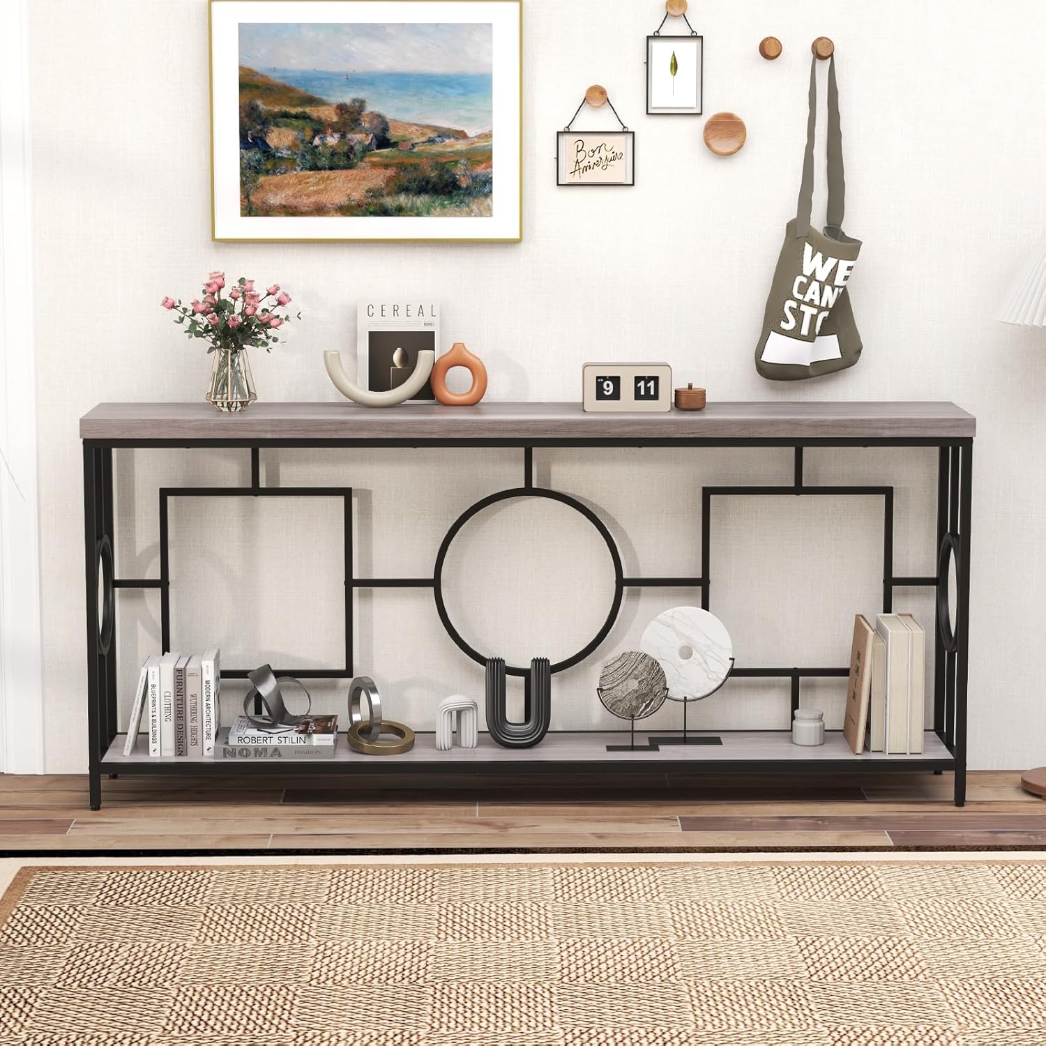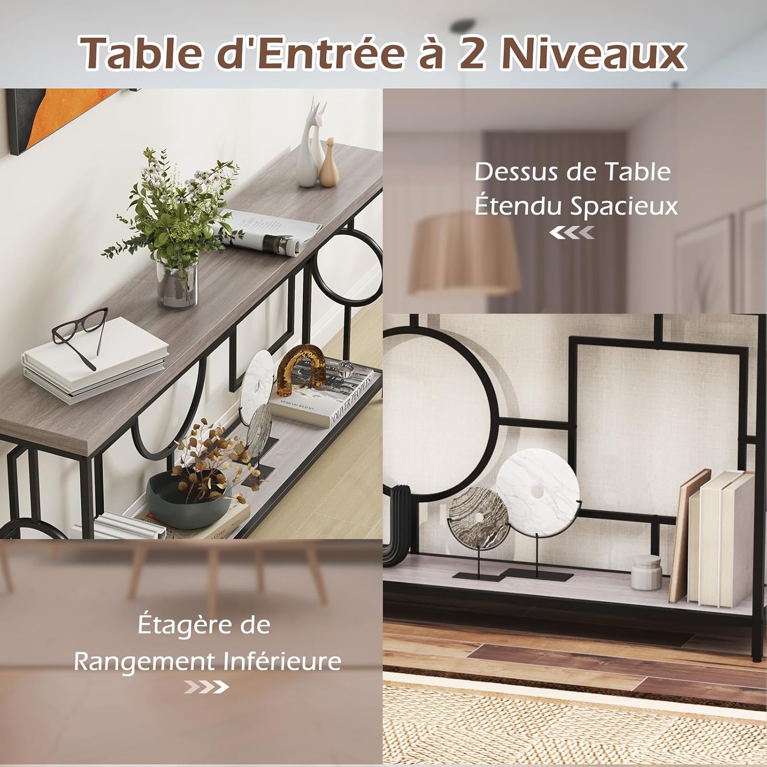 - Grande Capacité de Rangement — Cette table console spacieuse de 180 cm propose un design à deux niveaux, avec un large plateau supérieur et une étagère inférieure, offrant un espace généreux pour exposer des objets de décoration comme des vases, des lampes et des cadres photo, tout en gardant vos essentiels à portée de main et en rehaussant le style de votre espace.