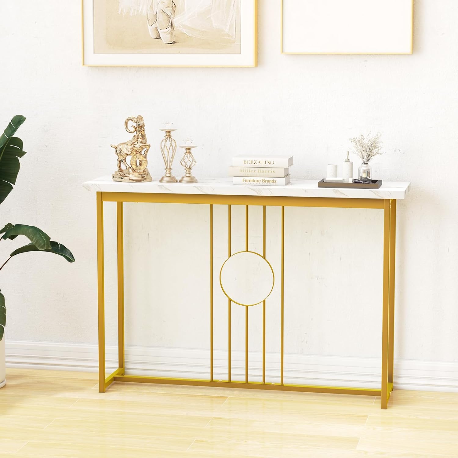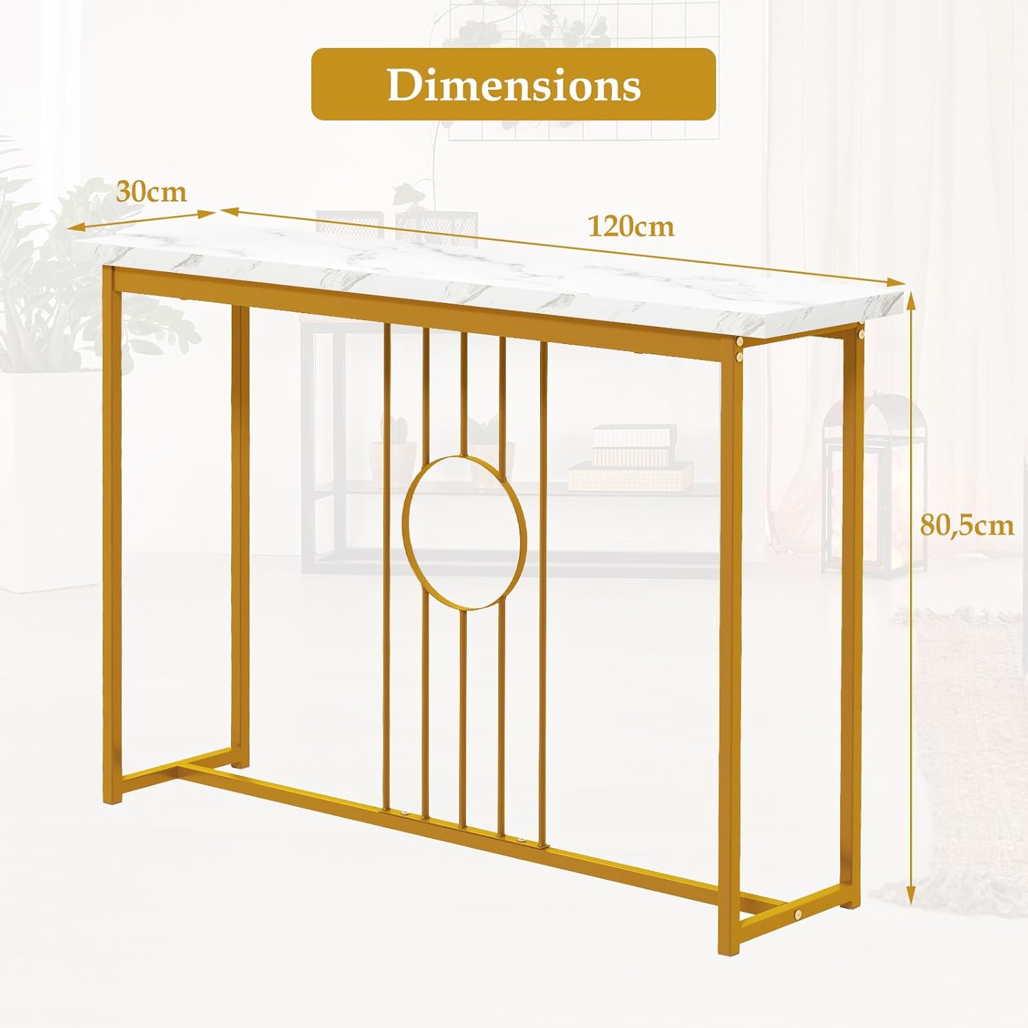 - Style moderne et élégant : cette table d'entrée dispose d'un plateau en marbre imitation réaliste. Les textures exquises du plateau se marient parfaitement avec les pieds en métal doré. Pendant ce temps, le design d'un cercle sur les supports verticaux lui présente une touche de luxe moderne créant un look élégant et attrayant.