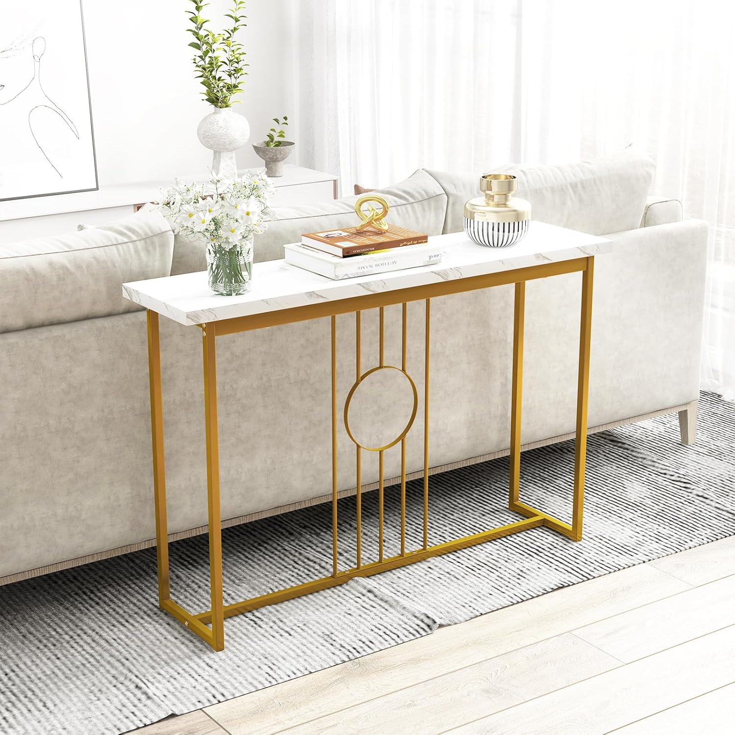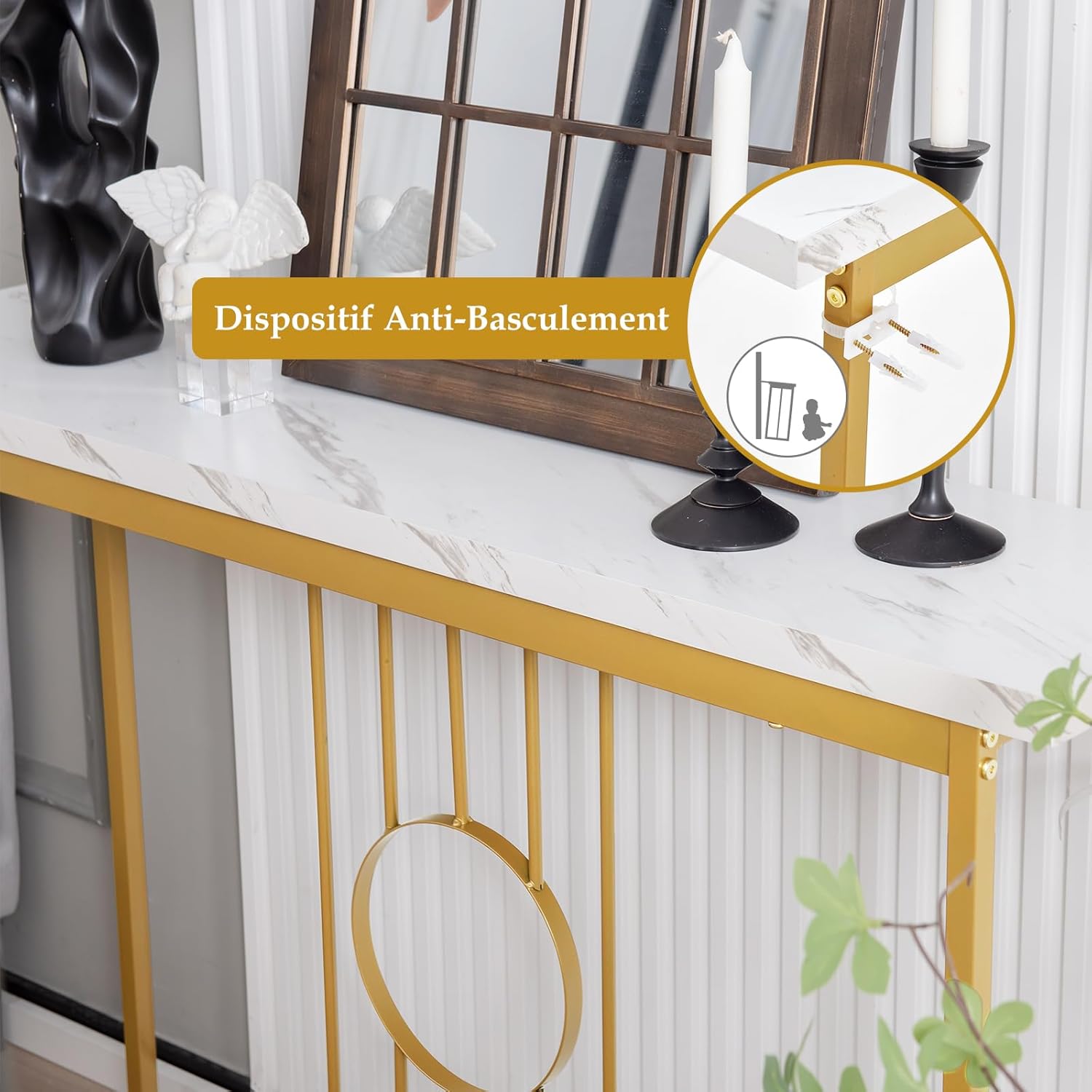 Vous cherchez une table avec fonction décorative et de rangement ? Vous pouvez jeter un coup d'œil à notre table console moderne. Dotée d'un plateau en marbre imitation réaliste et d'un cadre en métal doré, cette table console présente un look moderne et élégant en ajoutant un élément charmant et attrayant. En outre, le plateau est spacieux vous offrant un espace pour ranger vos magazines, cadre photo, clés, plantes, lunettes, etc. La structure en métal assure un support sûr et stable lors de l'utilisation, tandis que le plateau en bois d'ingénierie est également durable avec une longue durée de vie. Pour augmenter la sécurité et la stabilité, elle est également équipée d'un dispositif anti-basculement pour se fixer au mur. Elle peut répondre à vos divers besoins pour être placée dans le salon, la chambre, l'entrée, le couloir, etc. Emmenez cette table console chez vous et elle répondra parfaitement à vos besoins.