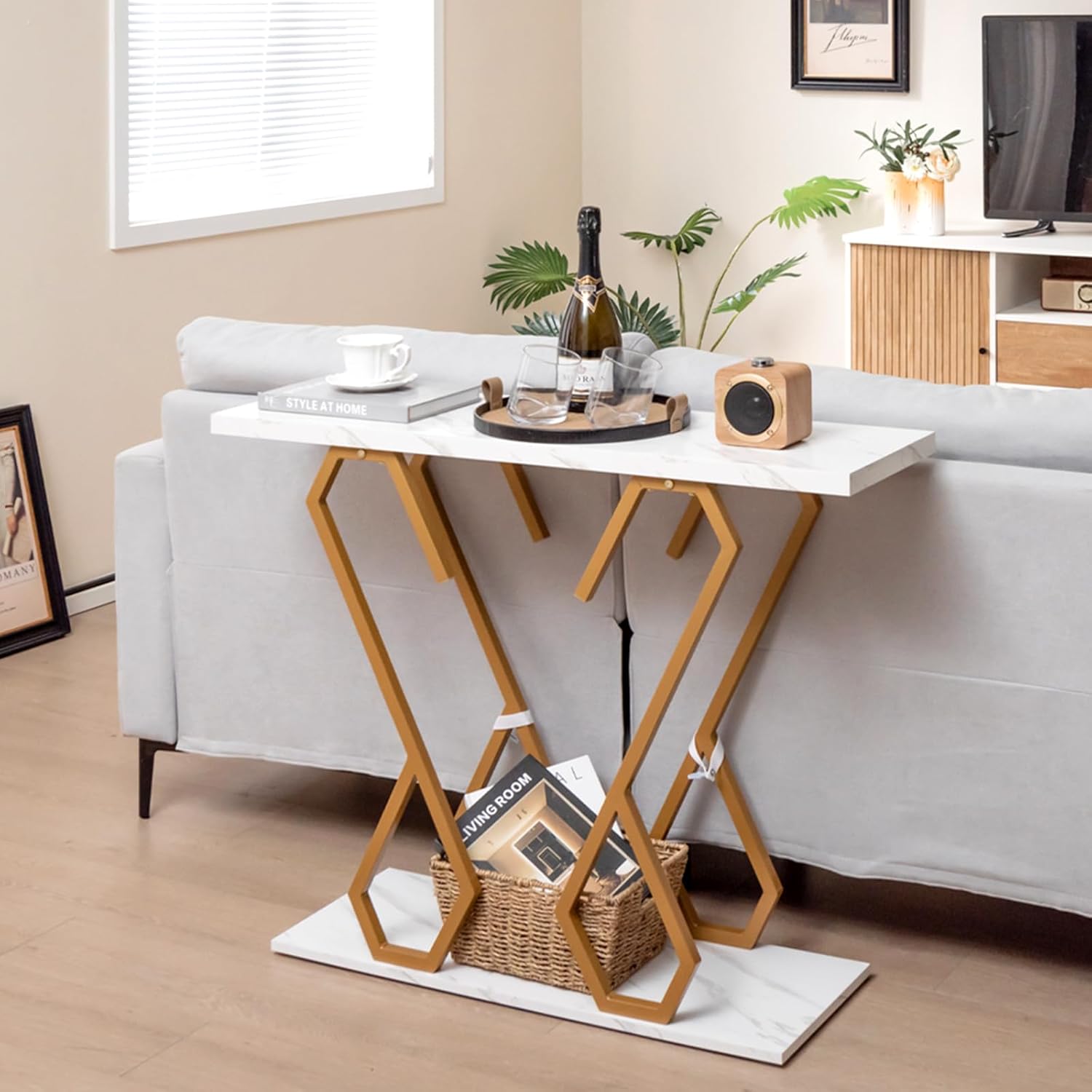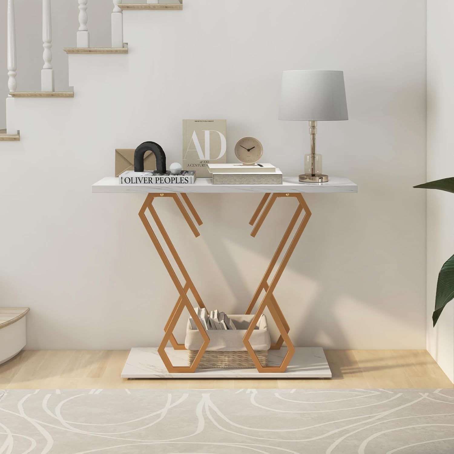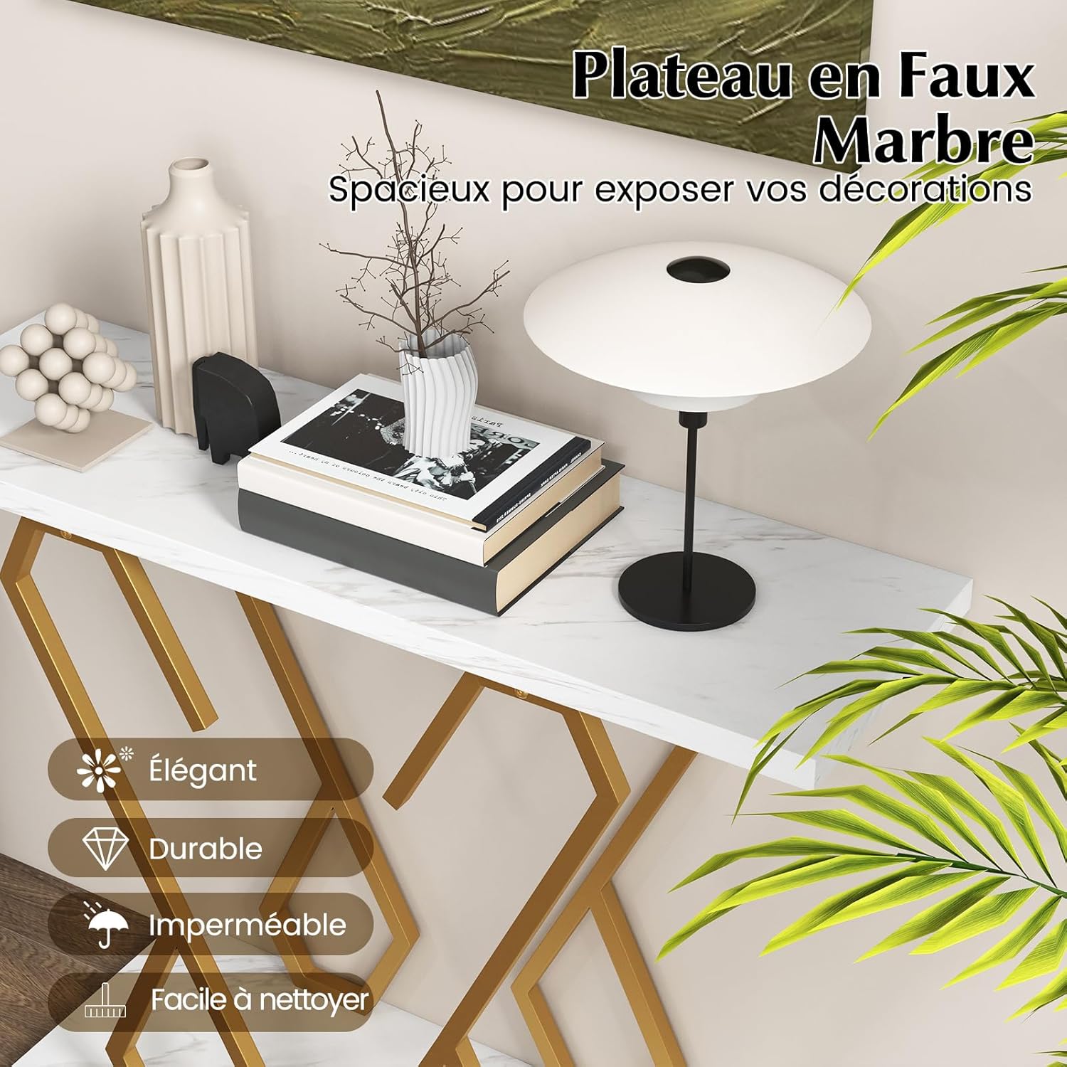 - Table d'entrée luxueuse et exquise — Le plateau de table texturé en faux marbre blanc impressionne par sa superbe qualité de fabrication et offre une esthétique visuelle unique. Le cadre géométrique en métal doré ajoute sophistication et élégance à cette table d'entrée au style luxueux.