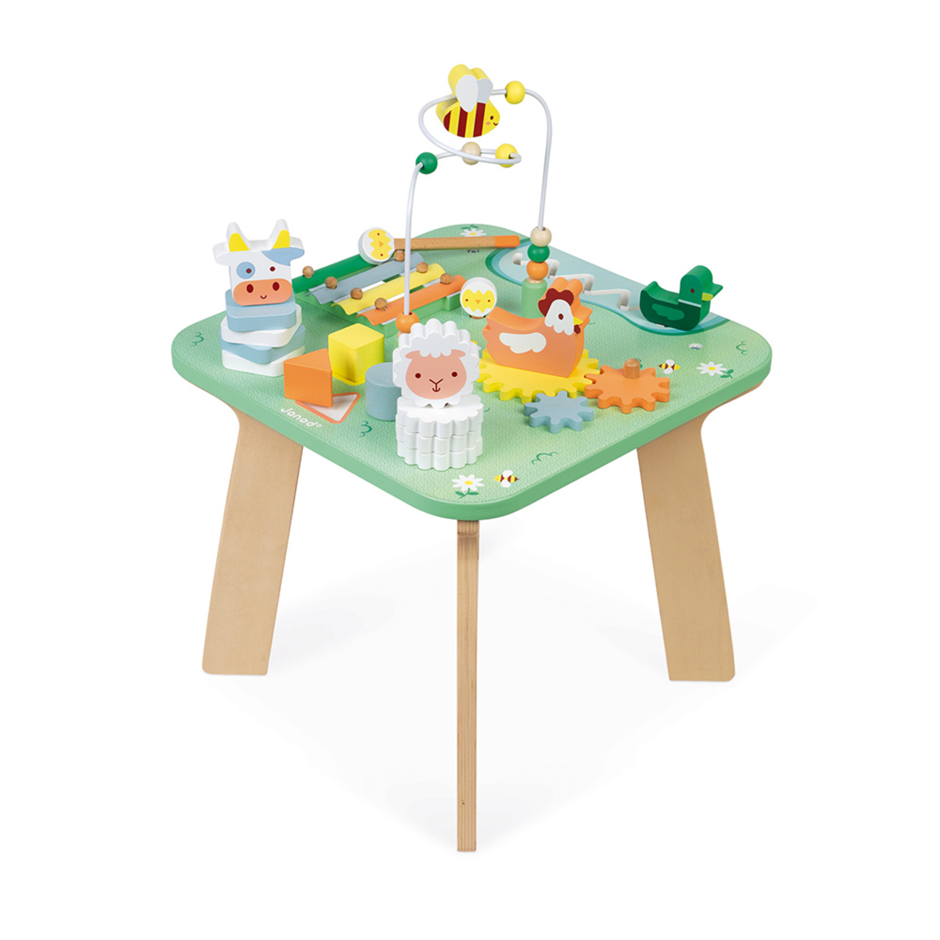 Jolie table multi-activités sur le thème de la ferme, idéale pour faire découvrir de nouveaux jeux à votre enfant ! Cette table ultra complète propose 7 activités : - 2 animaux à empiler de 2 manières différentes pour développer la motricité fine de votre enfant. - un labyrinthe avec un canard à promener dans sa mare pour renforcer sa coordination main/oeil. - un système d’engrenages à faire tourner pour le sensibiliser au rapport de cause à effet. - 3 cubes à encastrer pour apprendre les formes. - un boulier pour développer sa concentration. - un xylophone en métal avec ses 2 baguettes pour son éveil musical. Hauteur de la table : 32 cm. Peinture à l’eau. Dès 12 mois.