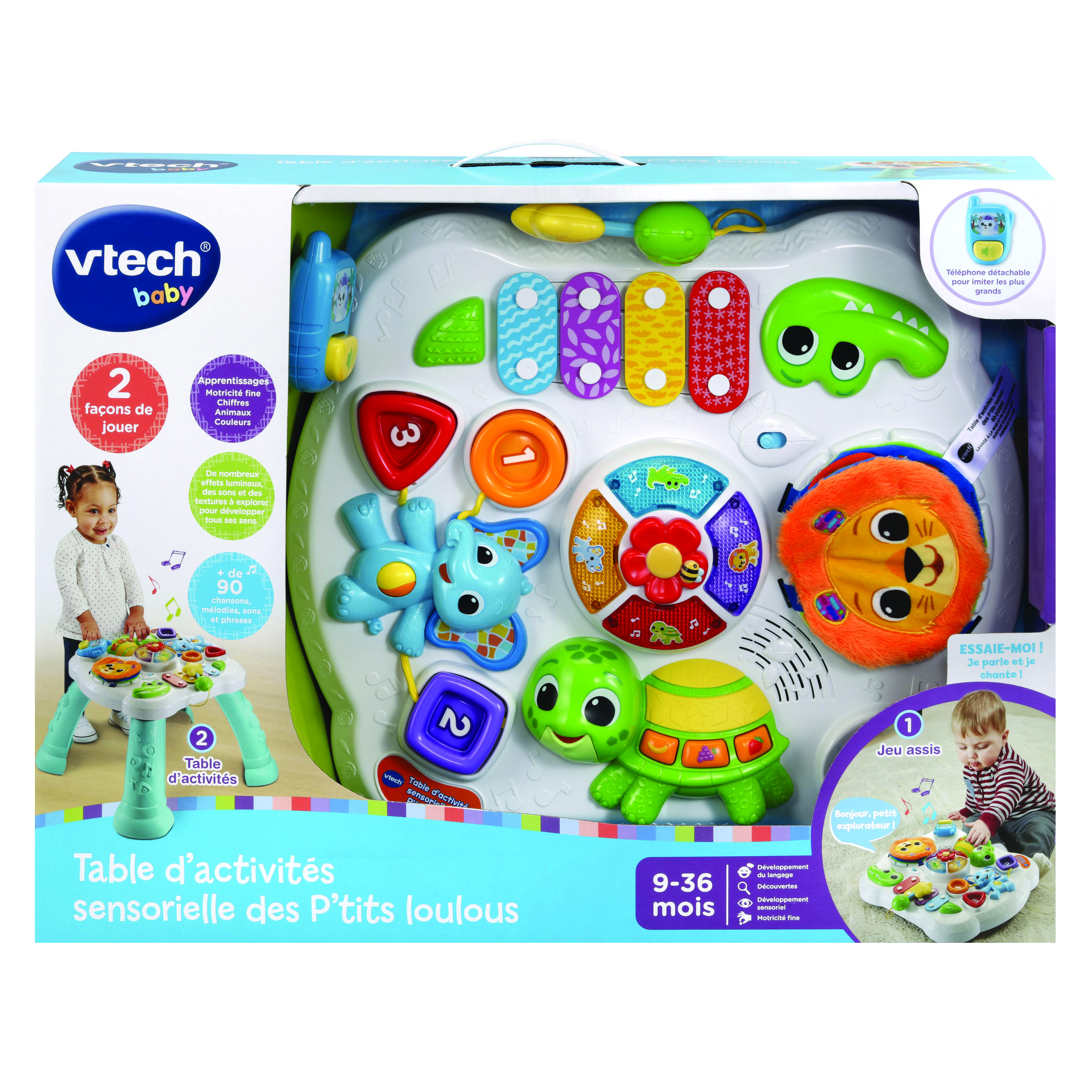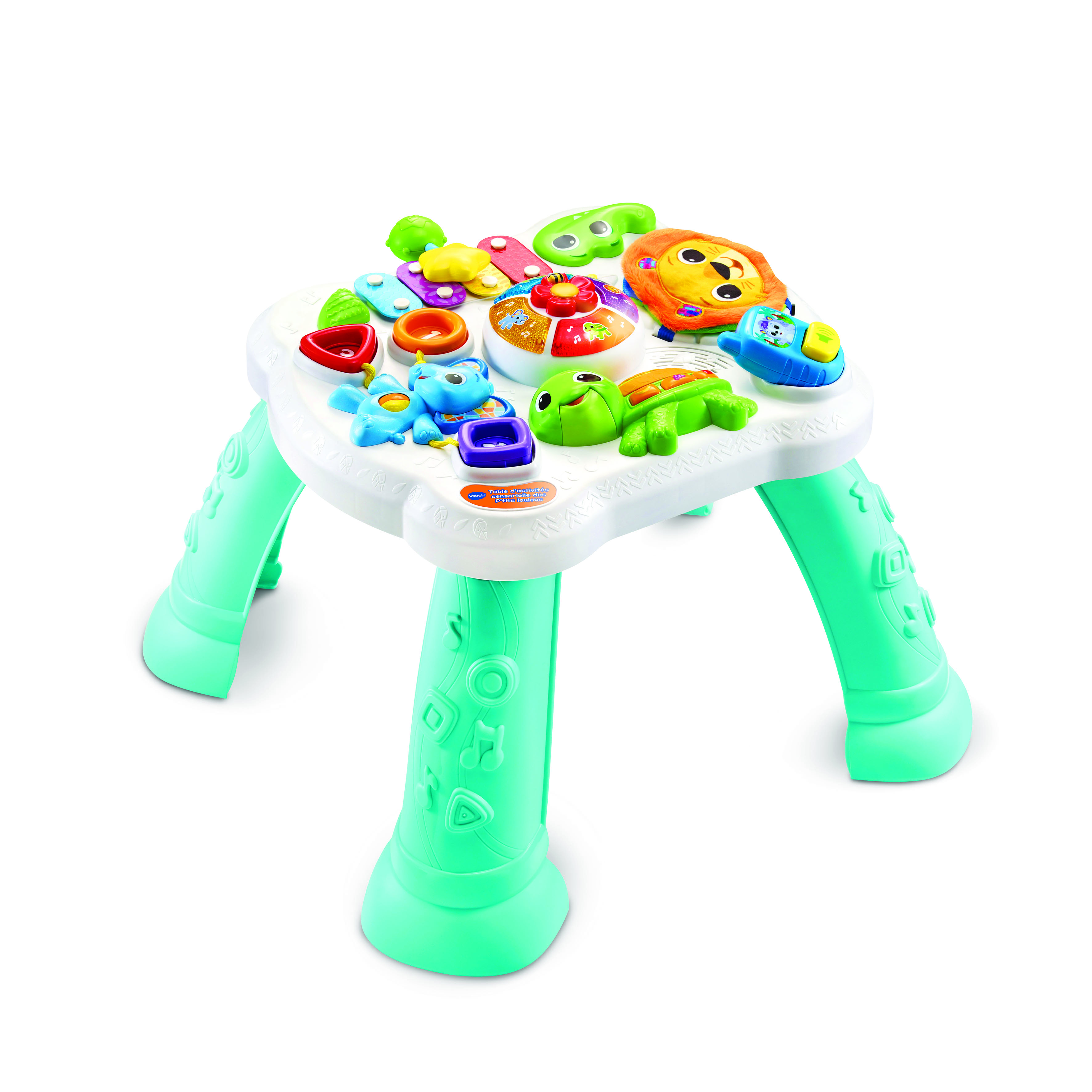 Table d’activités sensorielle des P’tits Loulous - 9- 36 mois Bébé développe ses sens et sa motricité avec sa table d’activités ! Il découvre un lion et un tigre en peluche. Bébé devient un musicien en herbe grâce au xylophone. Les touches métalliques présentent des motifs colorés différents. Grâce aux formes encastrables texturées, Bébé apprend les couleurs, les chiffres et les formes tout en développant sa motricité fine. Une tortue rigolote avec une carapace en plastique souple. Trois boutons pour apprendre les couleurs et les aliments. Effets lumineux sur la roue colorée à faire tourner. Un téléphone amovible inclus avec sons mécaniques. Génial ! Les pieds de la table se retirent facilement pour pouvoir jouer assis ! Plus de 90 chansons, mélodies, sons et phrases. Arrêt automatique. Réglage du volume sonore. Boîte Try-me. 2 piles LR6/AA fournies