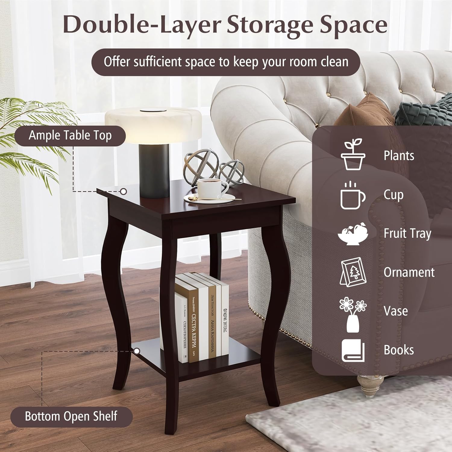 - Design double couche - Grâce à la double couche, vous pouvez ranger des consoles de jeux vidéo, des télécommandes, des tasses à café, des verres, etc. sur la couche supérieure de la table pour un accès facile. Sur le plan inférieur, vous pouvez ranger des magazines, des livres, etc. Vous pouvez également placer des pots de fleurs et d'autres décorations.