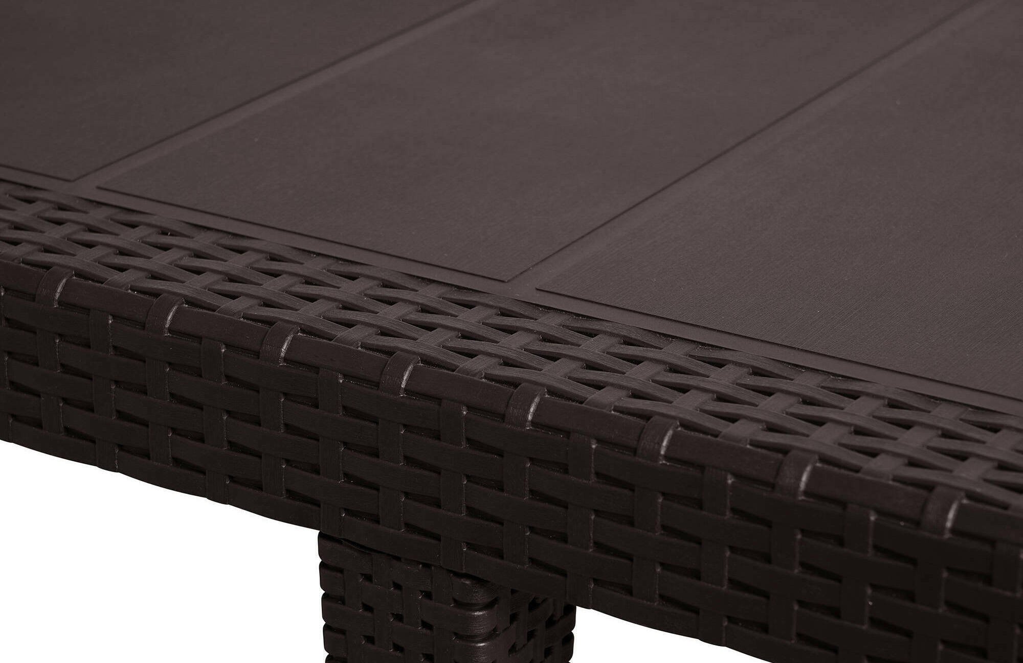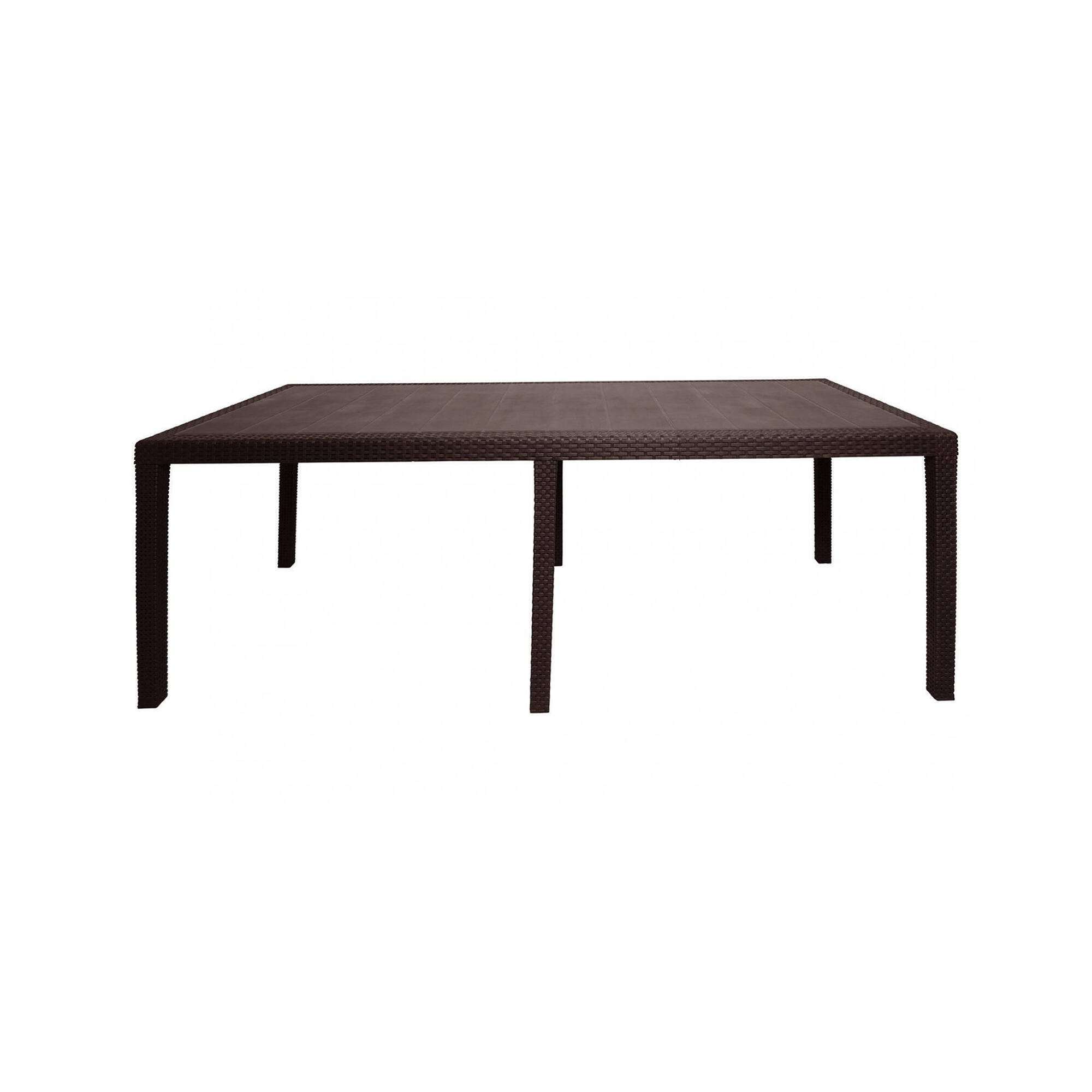 TABLE D'EXTÉRIEUR - Etagère de jardin extensible effet rotin, 100% Made in Italy, Cm 150/220x90h72, Marron. STRUCTURE ET UTILISATION - Table d'extérieur avec structure résistante en plastique renforcé - équipée d'une rallonge centrale de 70 cm et de 2 pieds supplémentaires qui garantissent sa stabilité - Produit avec finition effet rotin, qui garantit son confort et son style - Produit parfait pour meubler avec élégance votre extérieur espace, jardin, balcon ou véranda - Produit polyvalent qui peut être combiné avec différents types de chaises, peut également être utilisé à l'intérieur - Produit peu encombrant idéal pour accueillir jusqu'à 10 personnes pour le déjeuner. 100% MADE IN ITALY - La production 100% Italyenne garantit fiabilité, résistance et durabilité dans le temps - L'attention portée aux processus de production, le choix des matières premières de qualité et le souci du détail font de ce produit une fabrication noble. CARACTÉRISTIQUES TECHNIQUES - Entièrement en polypropylène résistant, il peut être positionné à l'extérieur, résiste facilement au soleil et à la pluie, il est imperméable et déperlant - Entièrement lavable, facile à nettoyer - Montage simple et rapide. DIMENSIONS DU PRODUIT EN CM - Longueur: 150 fermé, 220 ouvert - Largeur: 90 - Hauteur: 72