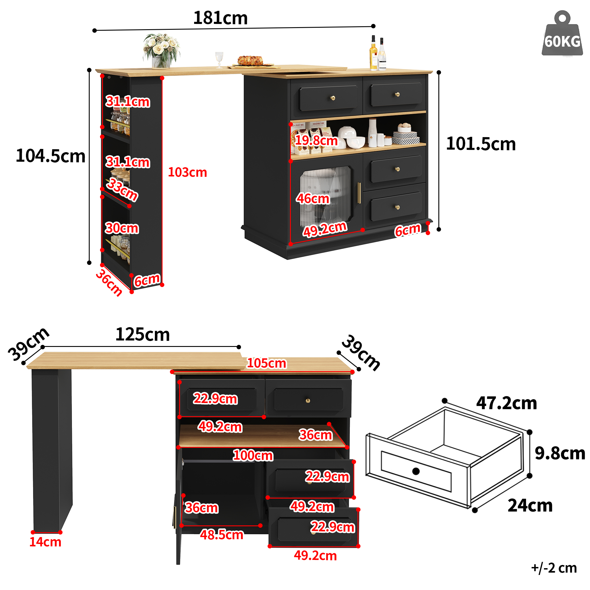 | Libellé | Table de bar noir extensible 125-181cm avec rangement et plateau pivotant, buffet avec 4 tiroirs, étagères et porte en verre |