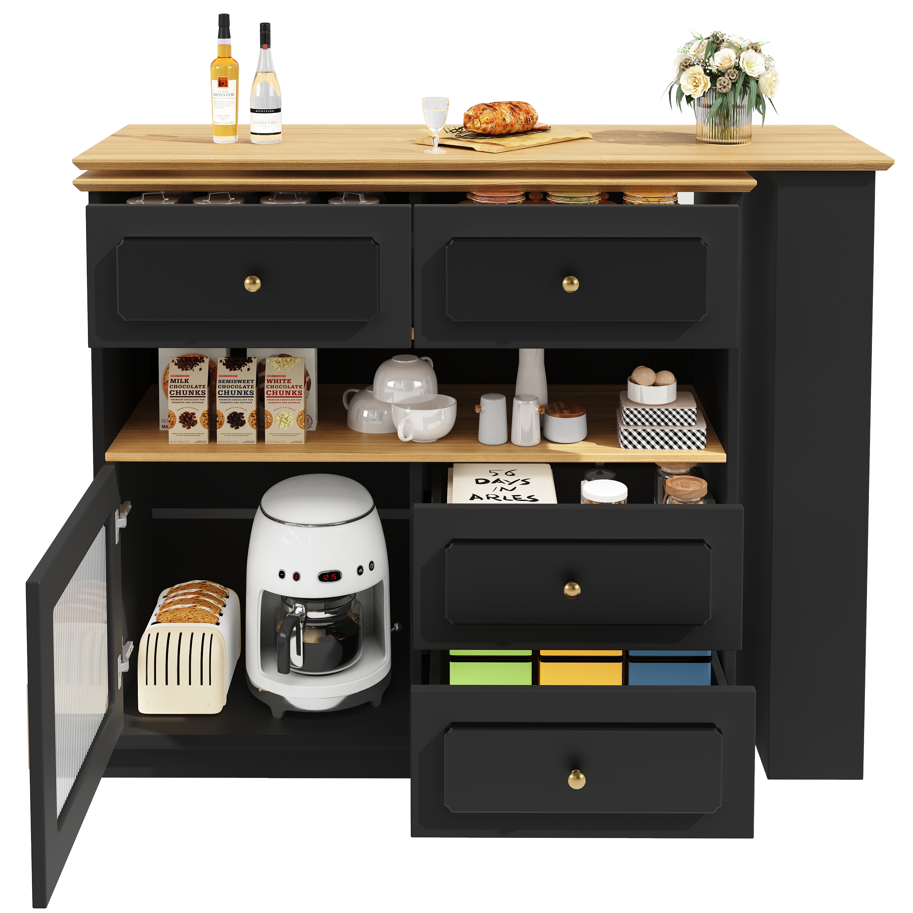Avec son compartiment ouvert, son étagère à trois niveaux et ses quatre tiroirs, ce meuble offre des solutions de stockage variées pour organiser objets du quotidien, vaisselle ou accessoires, alliant praticité et gain de place.
