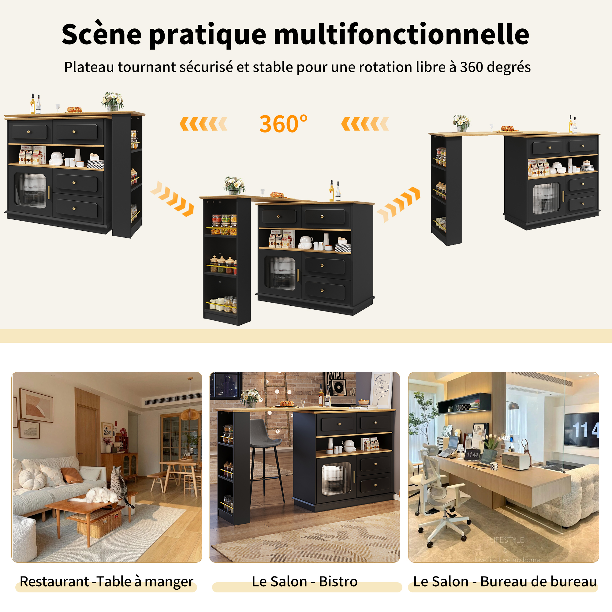 Grâce à son plateau rotatif stable et sécurisé, ce meuble s’adapte à divers usages