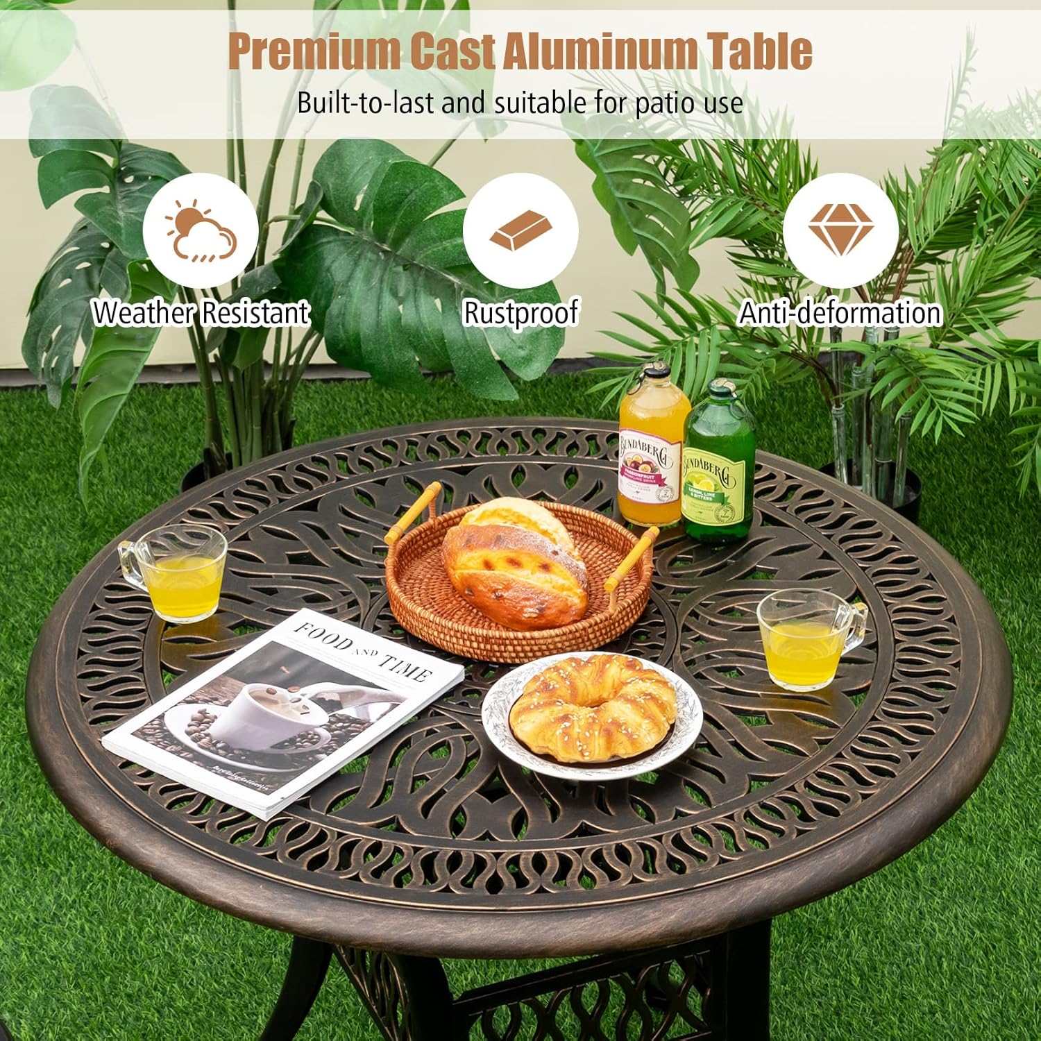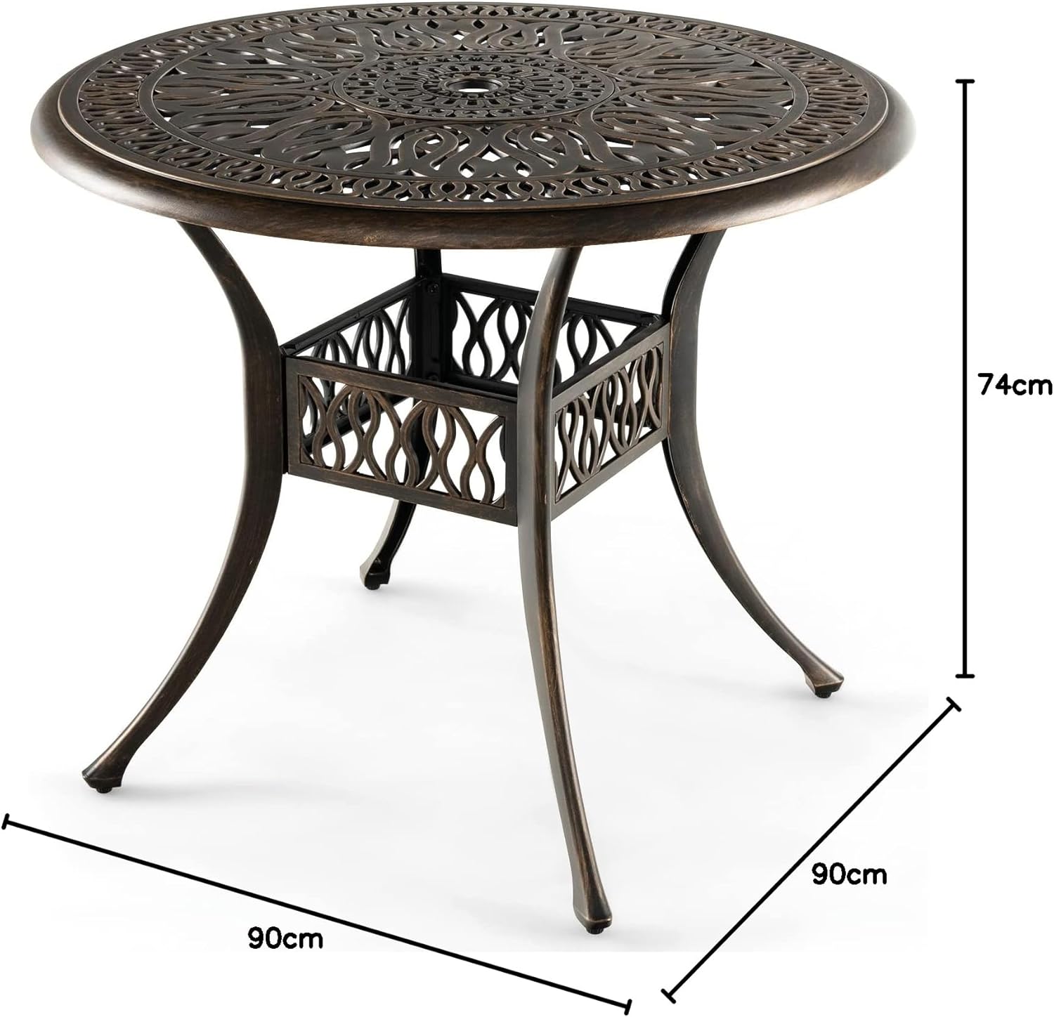 Cette table de bistrot en fonte d'aluminium rendra votre vie en plein air plus confortable ! Combinant un beau look d'inspiration vintage avec une construction stable et robuste, notre table de jardin ronde de 90 cm de diamètre offre suffisamment d'espace pour 4 personnes afin de partager des moments de qualité avec votre famille. De plus, le trou de 5 cm pour le parasol permet de profiter de l'ombre en été. Cette table de bistrot ronde sera sans aucun doute le choix idéal pour différents environnements extérieurs.