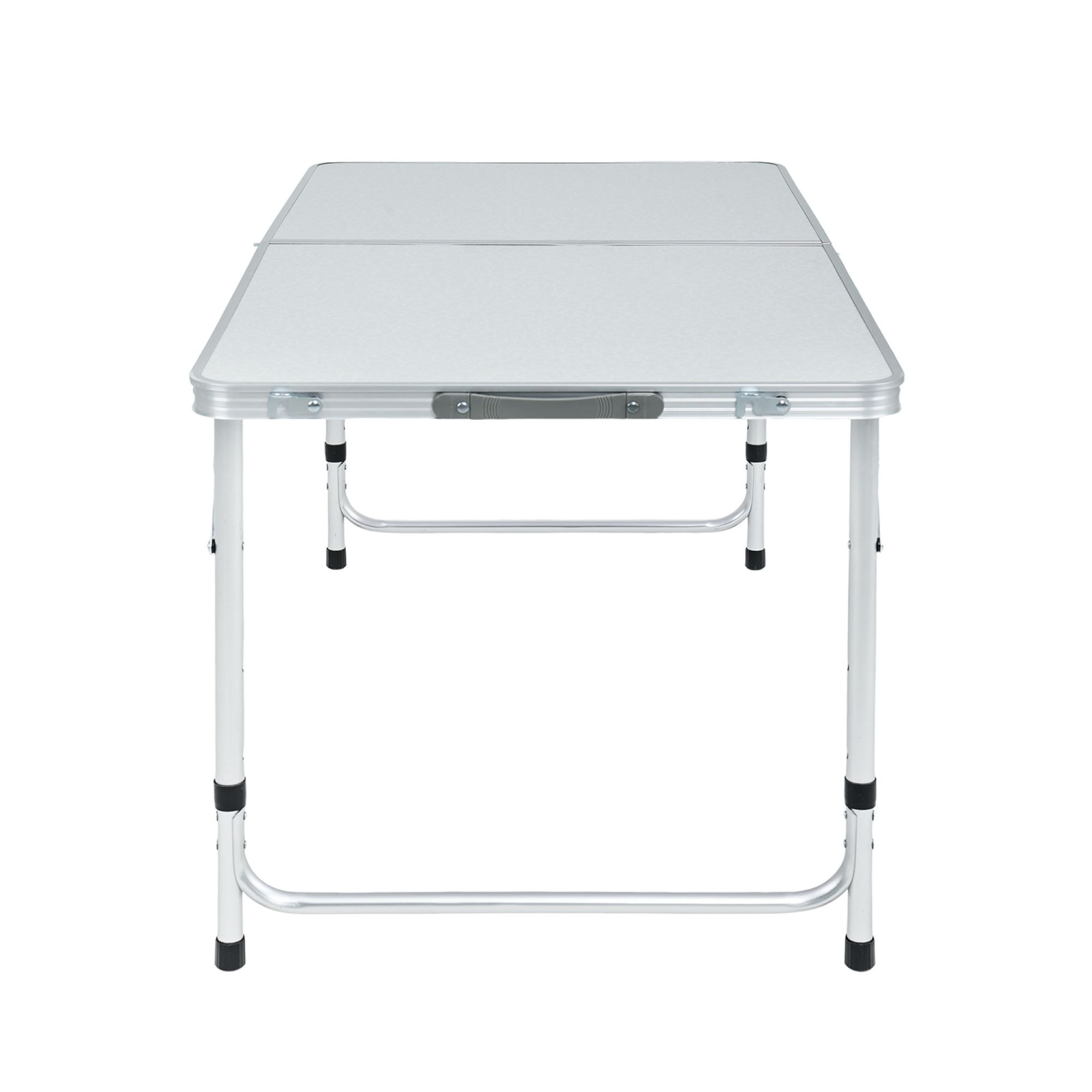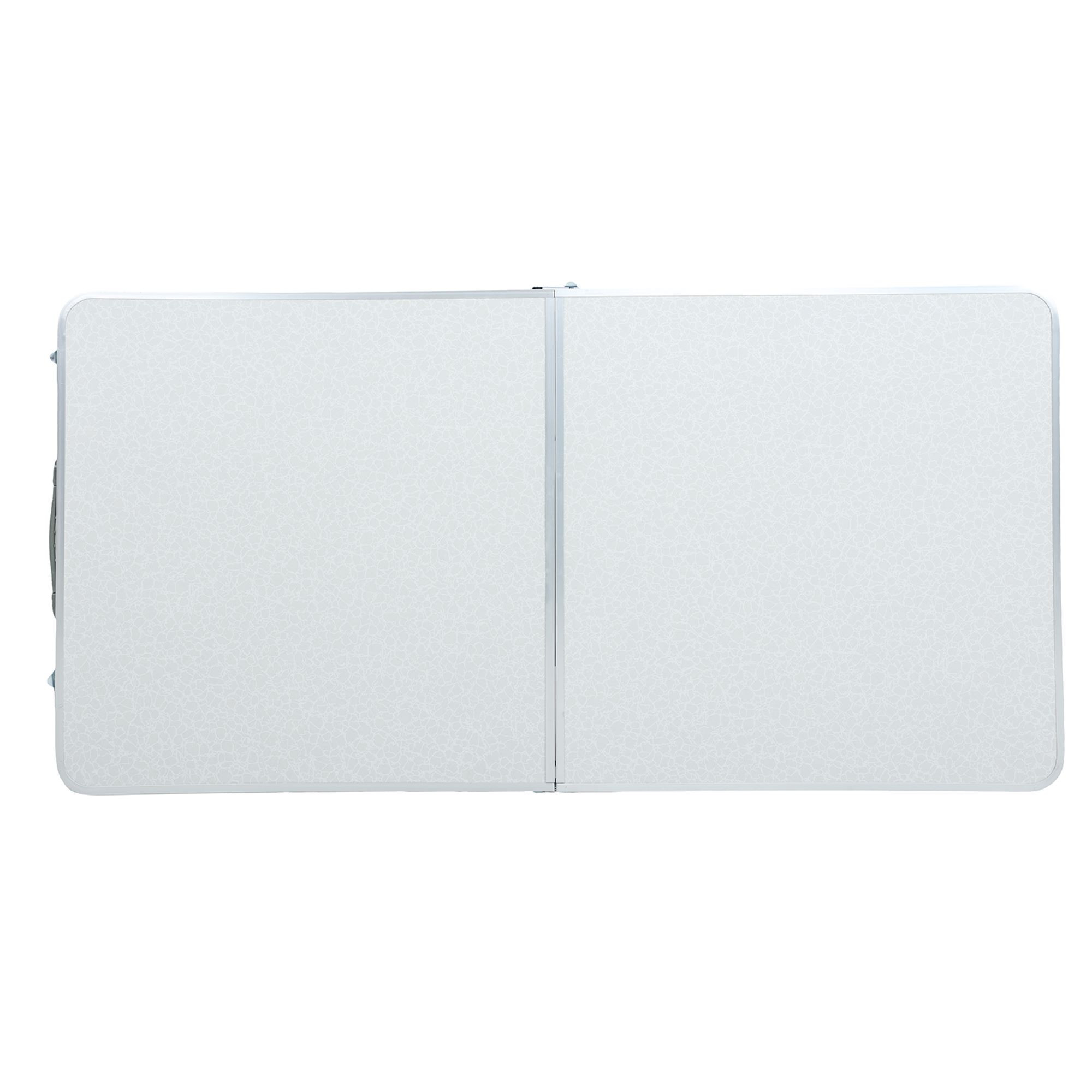 - Matériaux de qualité : Le plateau de la table est en MDF blanc avec une optique marbre, tandis que le châssis de la table est en aluminium avec une poignée de transport. Les chaises sont fabriquées en polyester Oxford 600D résistant et une structure métallique d'un diamètre de 18 mm.
