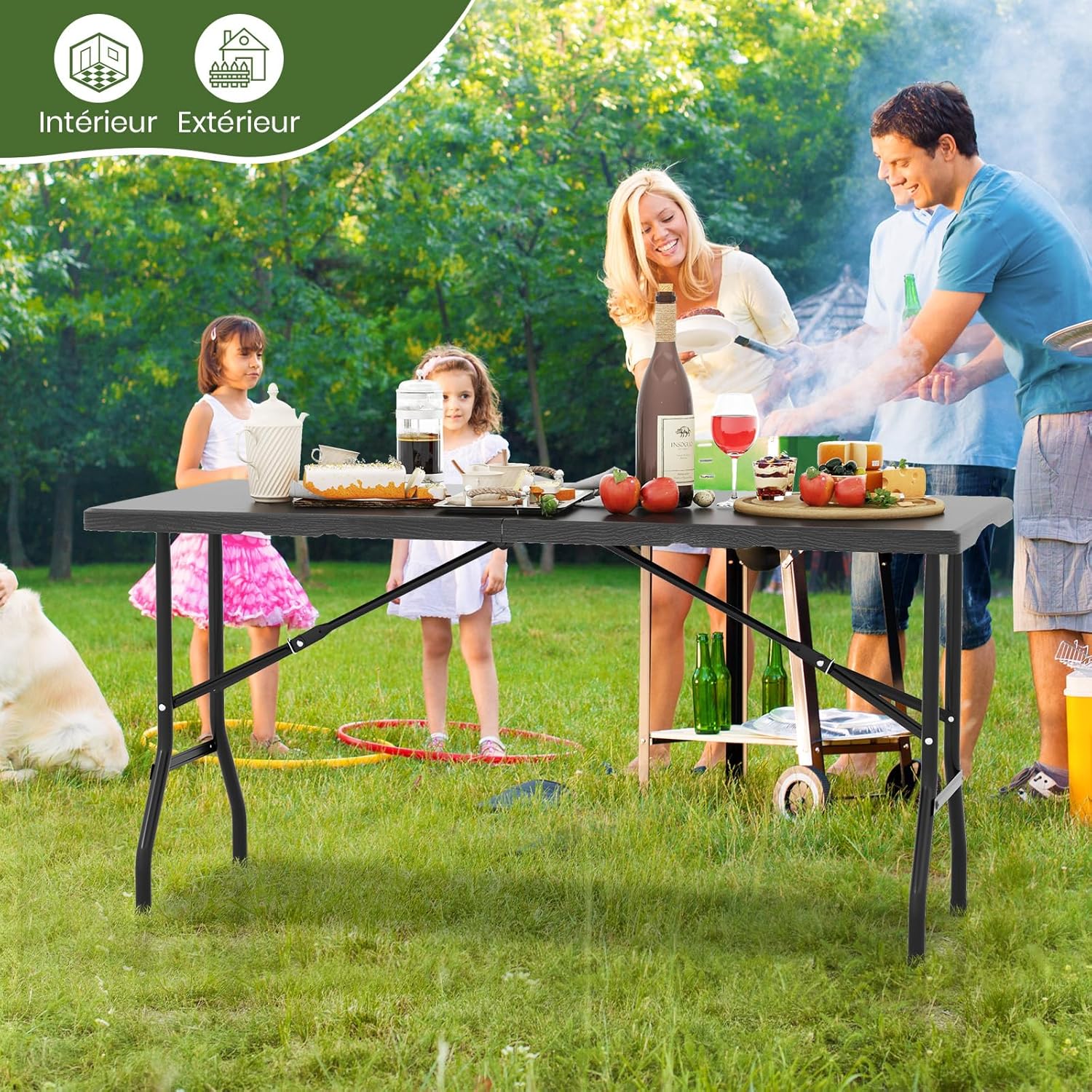 | Libellé | Table de camping pliable, portable avec plateau en hdpe à motif bois, cadre en métal poignée de transport |