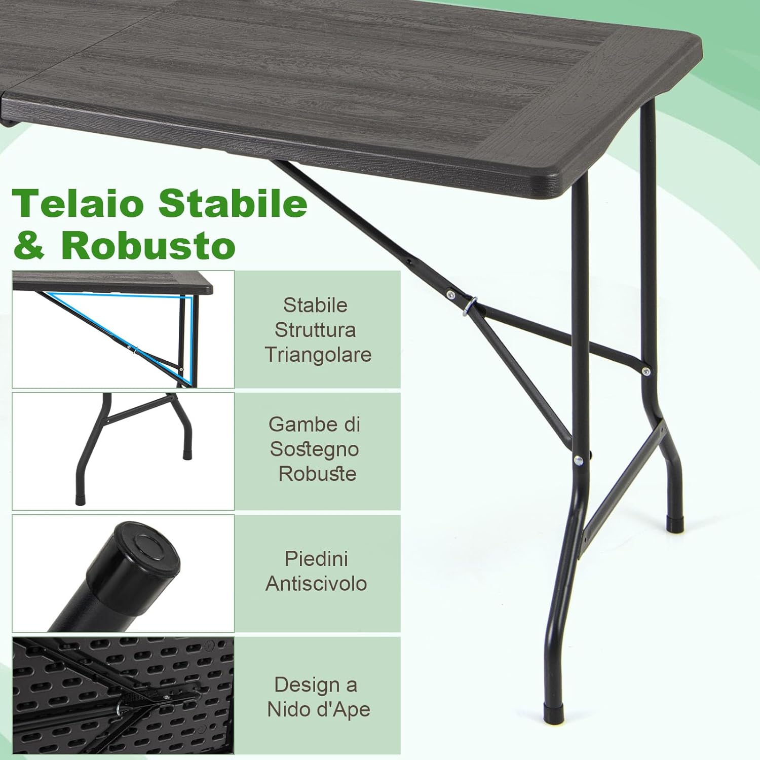 - Plateau spacieux en HDPE : Cette table de camping possède un plateau spacieux de 152 x 70 cm, offrant un large espace pour vos affaires. Le plateau est fabriqué en matériau HDPE avec une surface à imitation bois, qui est à la fois élégante, pratique, résistante et facile à nettoyer.