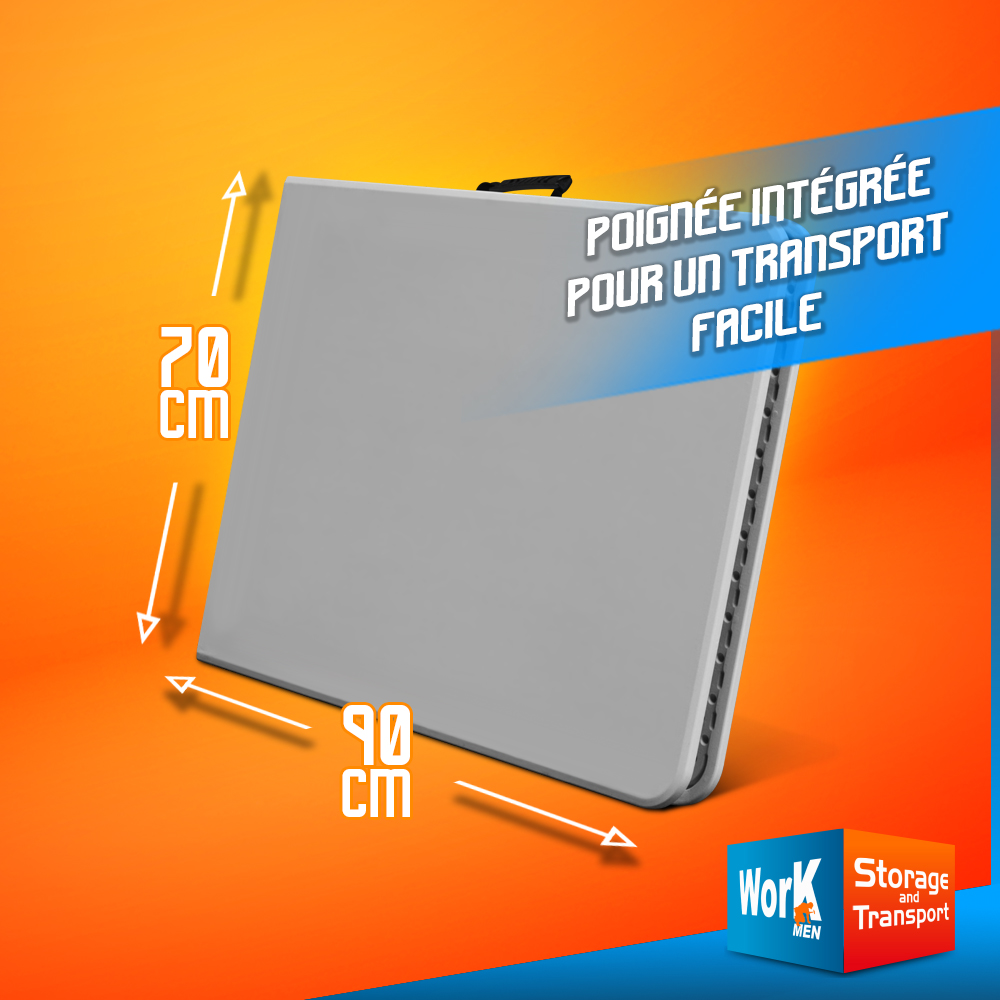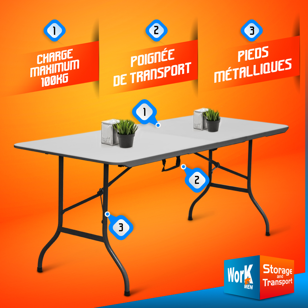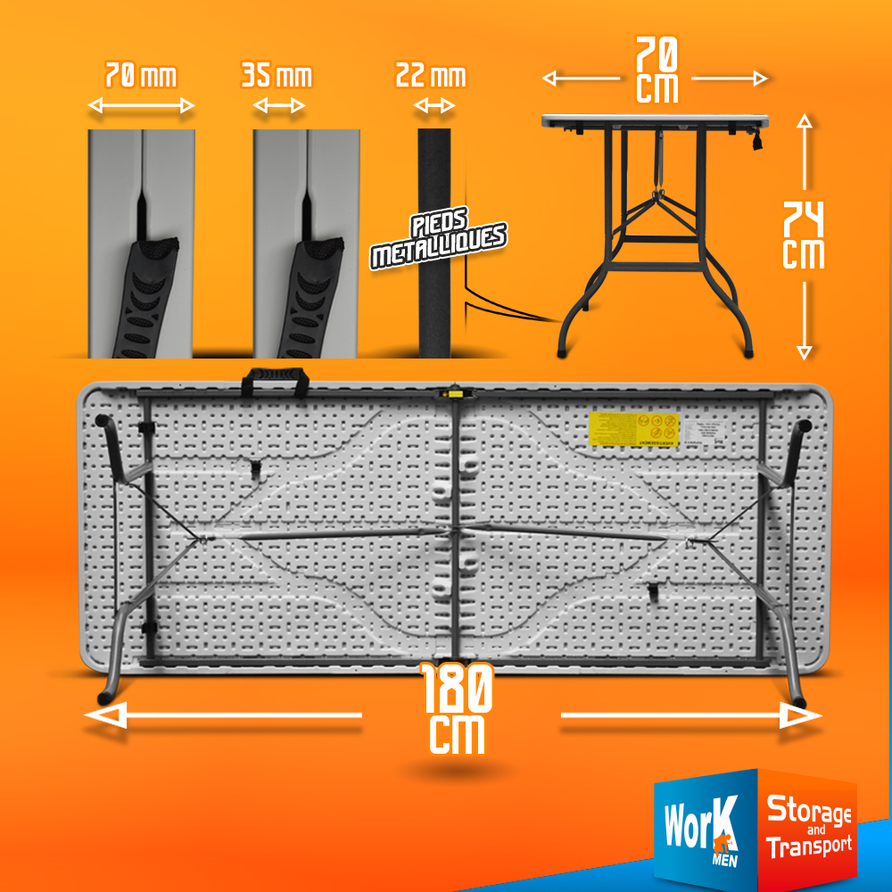 Cette table pliante Workmen Storage de dimensions 180 x 70 x 74 cm est idéale pour le camping, les fêtes ou pour tout événement qui nécessite d?asseoir un grand nombre de personnes. Grâce à une structure robuste, elle permet de supporter une charge allant jusqu?à 100 kg. Elle est pliable et possède une poignée intégrée afin de faciliter le transport. Sa dimension réduite une fois pliée permet de la stocker facilement.