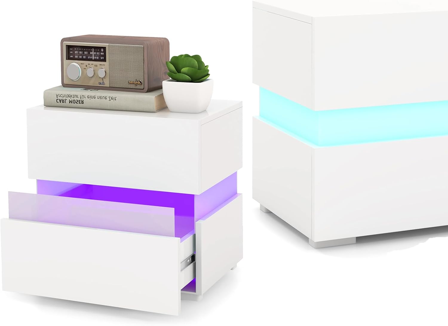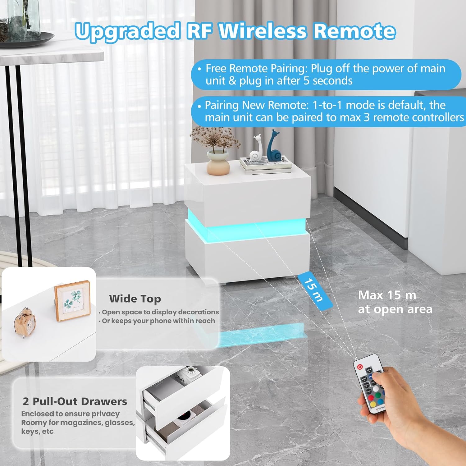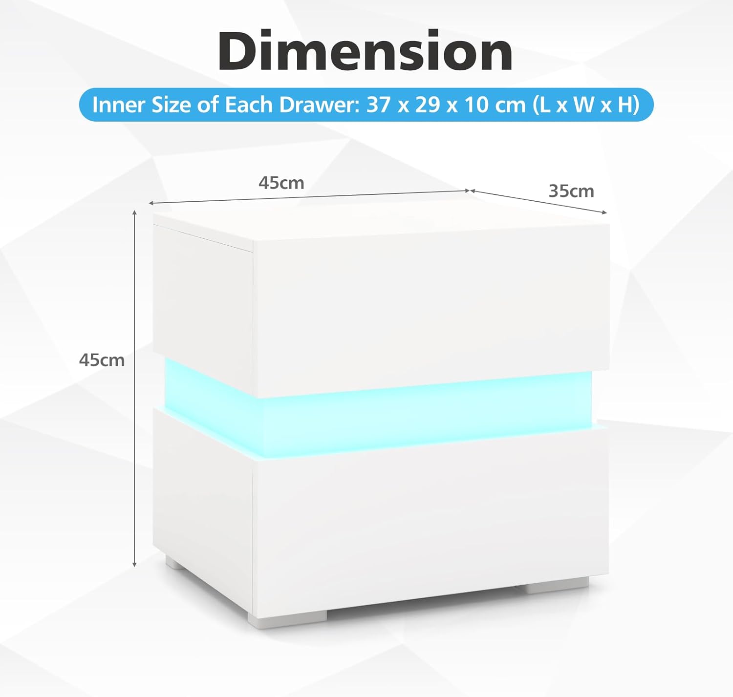 La table de chevet de chambre est la solution parfaite pour organiser votre espace avec style. Avec un grand espace de rangement, les deux tiroirs spacieux et les trous pour les câbles vous permettent de garder tout en ordre. Les lumières LED colorées sont un véritable spectacle, offrant 22 modes dynamiques pour créer une atmosphère spéciale. Grâce à la télécommande réglable, il est facile de contrôler les couleurs et la luminosité de la lumière. Robuste et stable, cette table de chevet polyvalente s'adapte à toutes les pièces de la maison avec facilité.