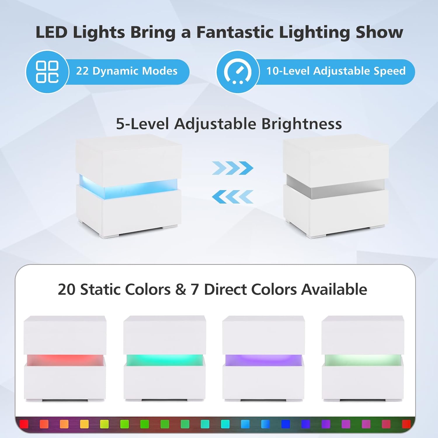 Table de chevet à led, 22 modes de lumière, 10 vitesses, 5 luminosité, table de nuit (blanc, lot de 2)