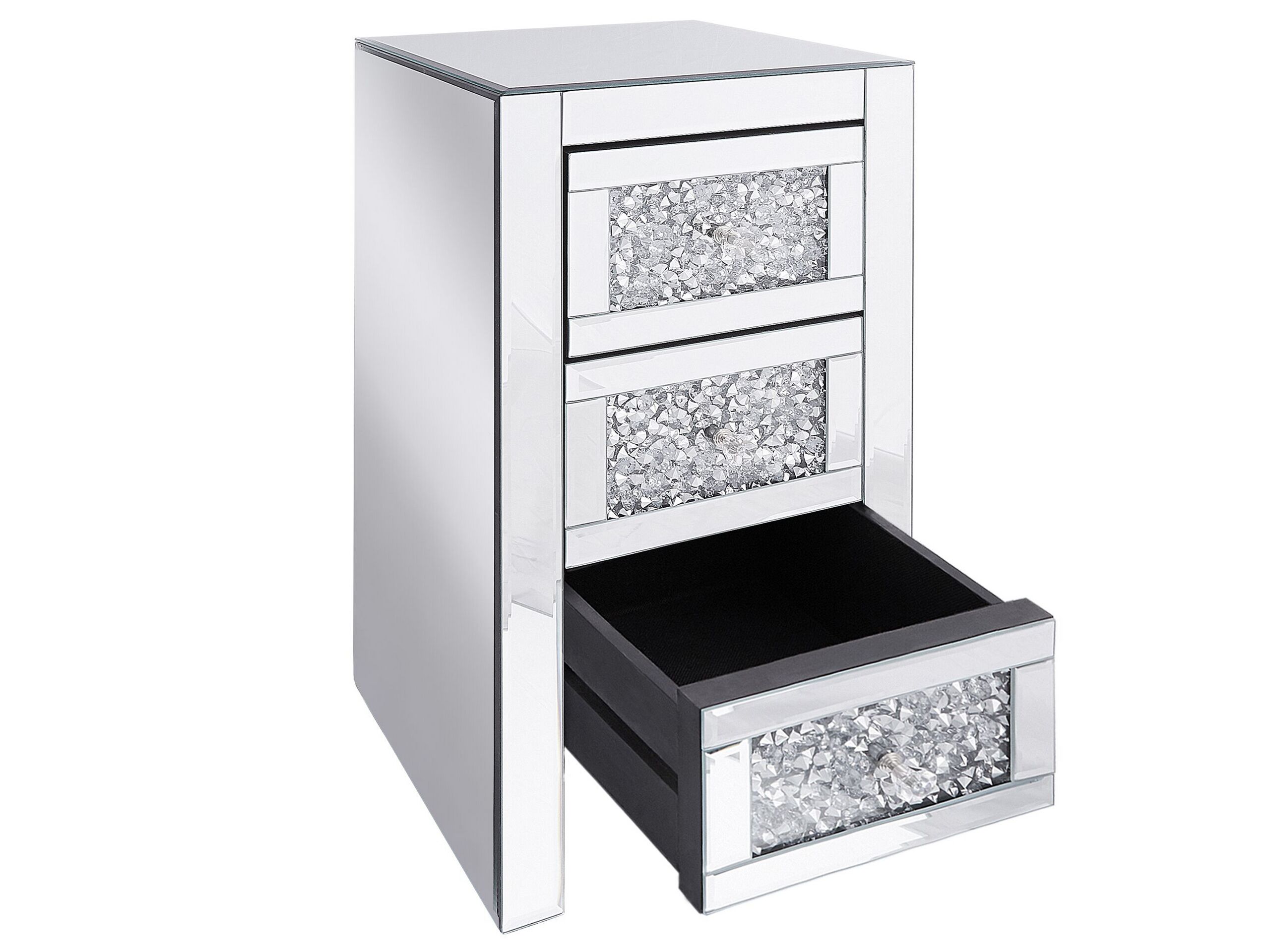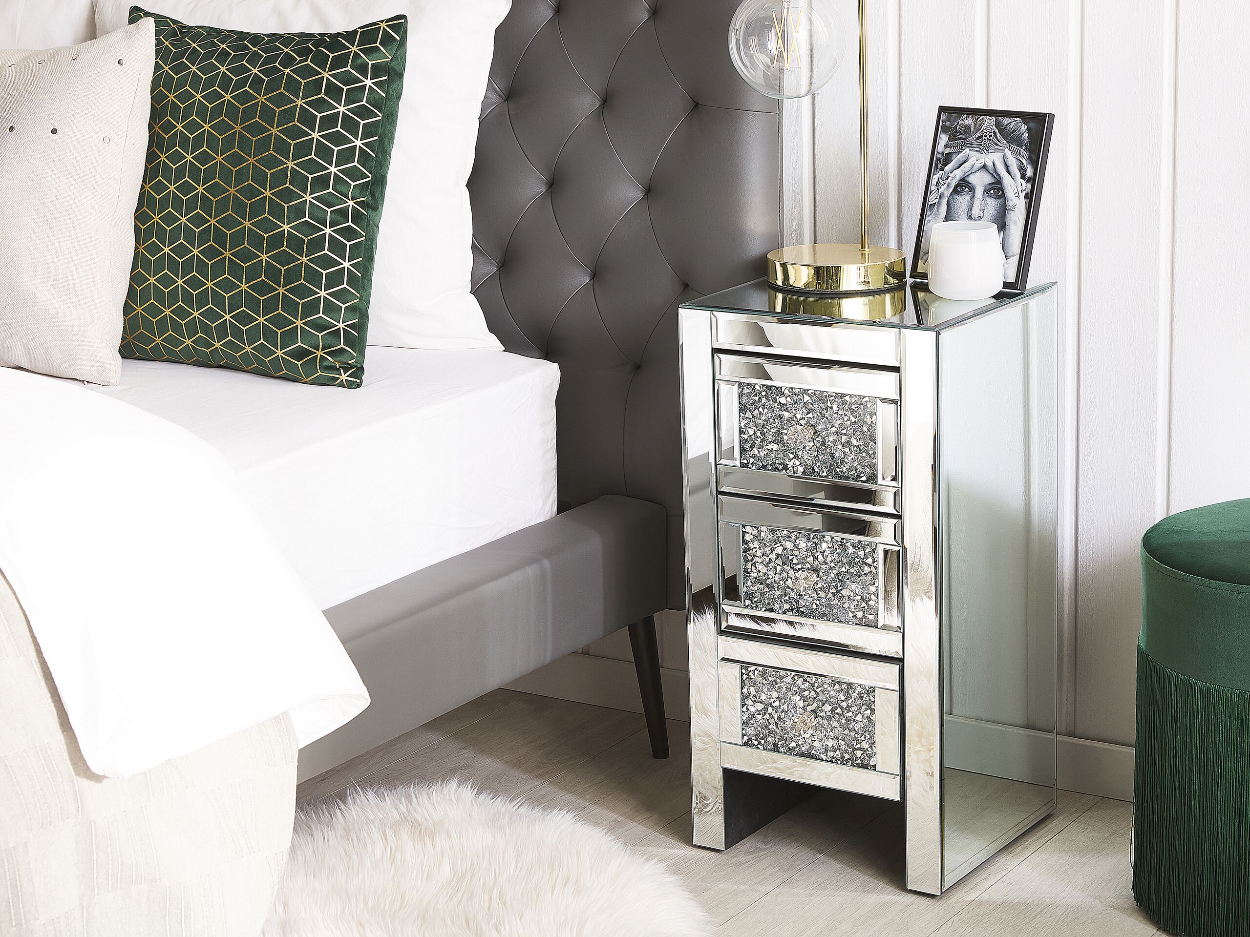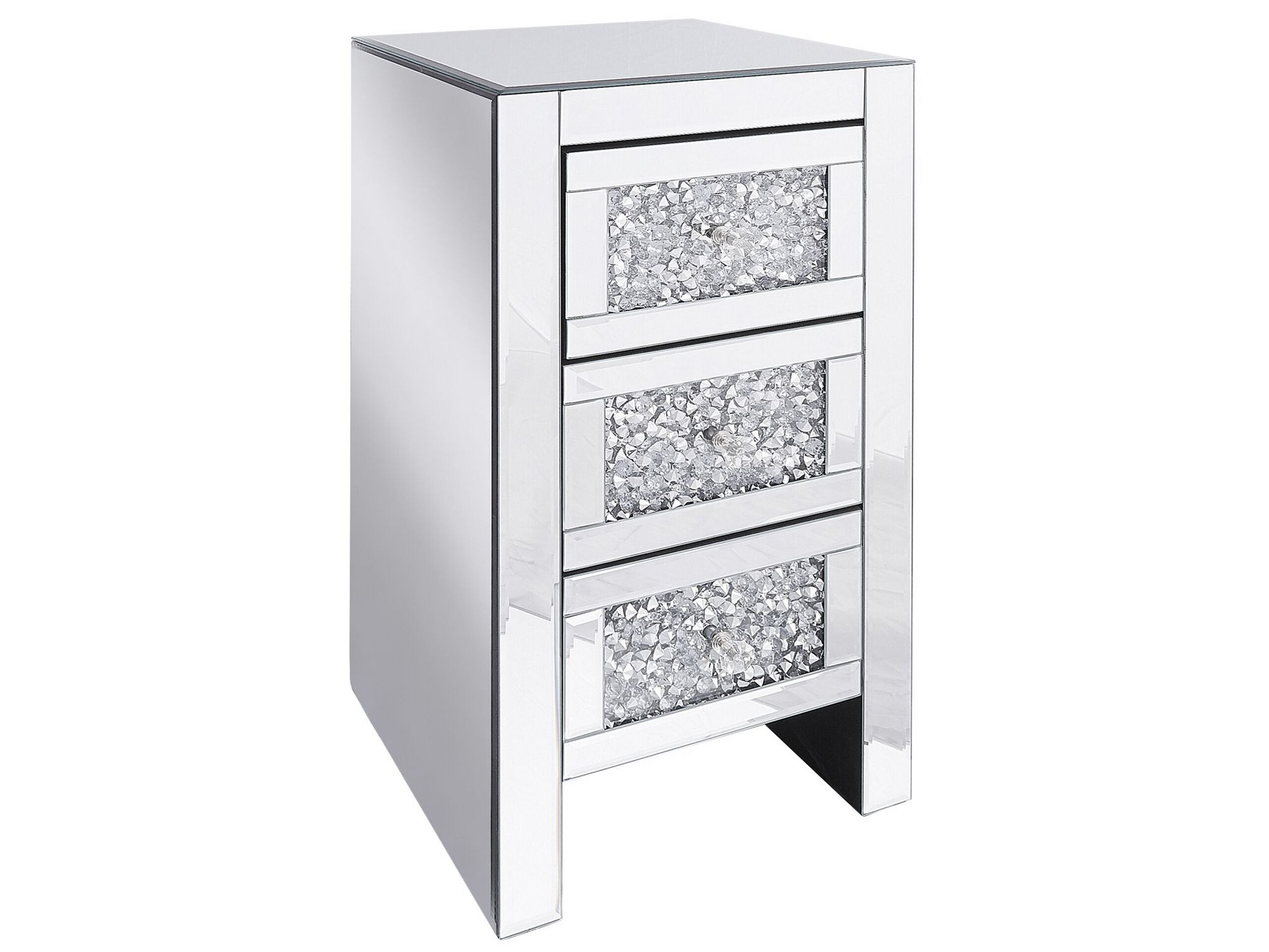 Table de nuit au style glamour avec miroir et faux diamants broyés. Cette commode à miroir glamour est un complément parfait à tout intérieur de style glamour. Dotée de trois tiroirs avec mécanisme de fermeture en douceur, elle vous aidera à garder votre salon ou votre chambre bien rangée. Les boutons en cristal brillant et les façades étincelantes en font une décoration qui attire le regard.