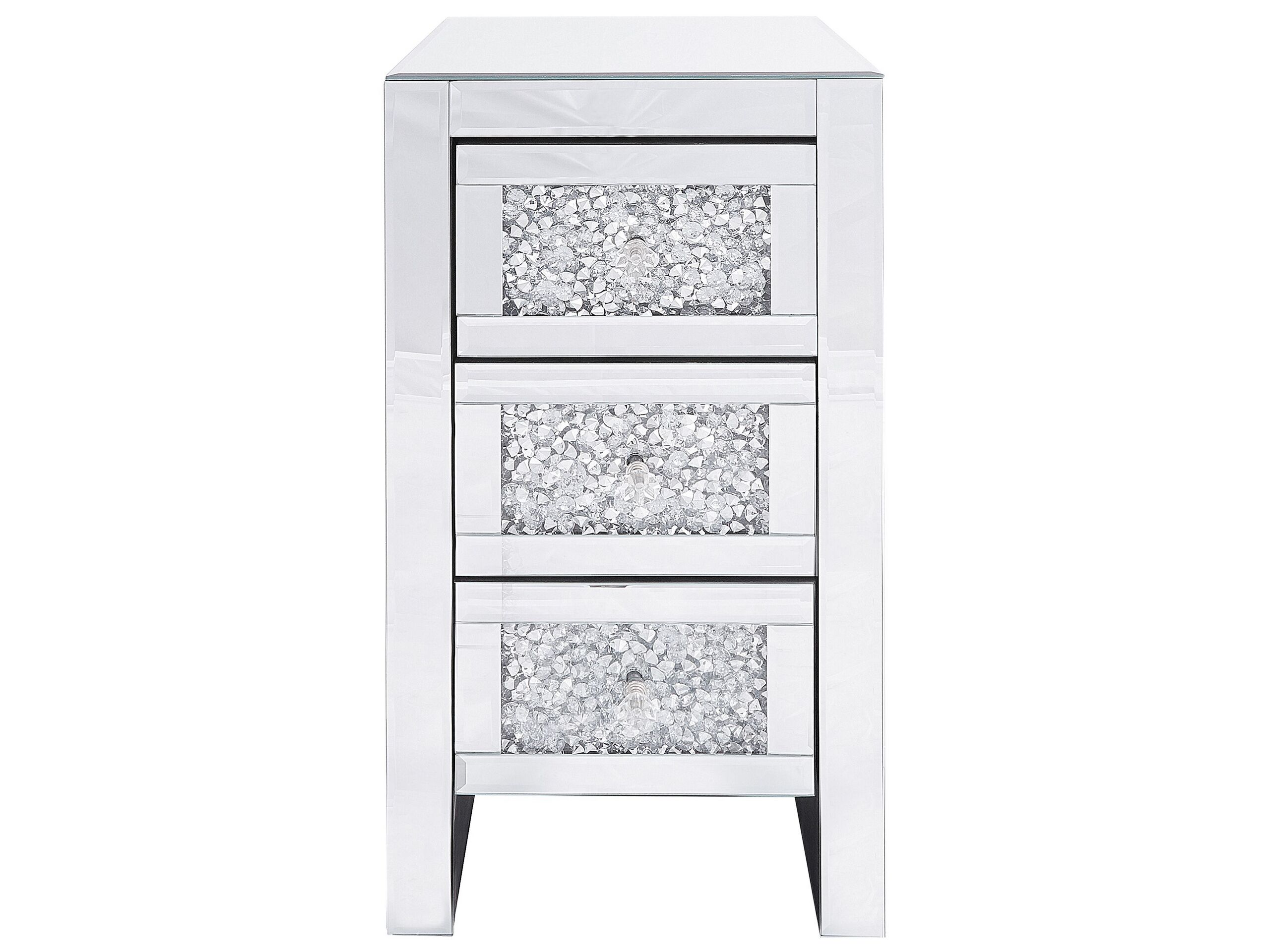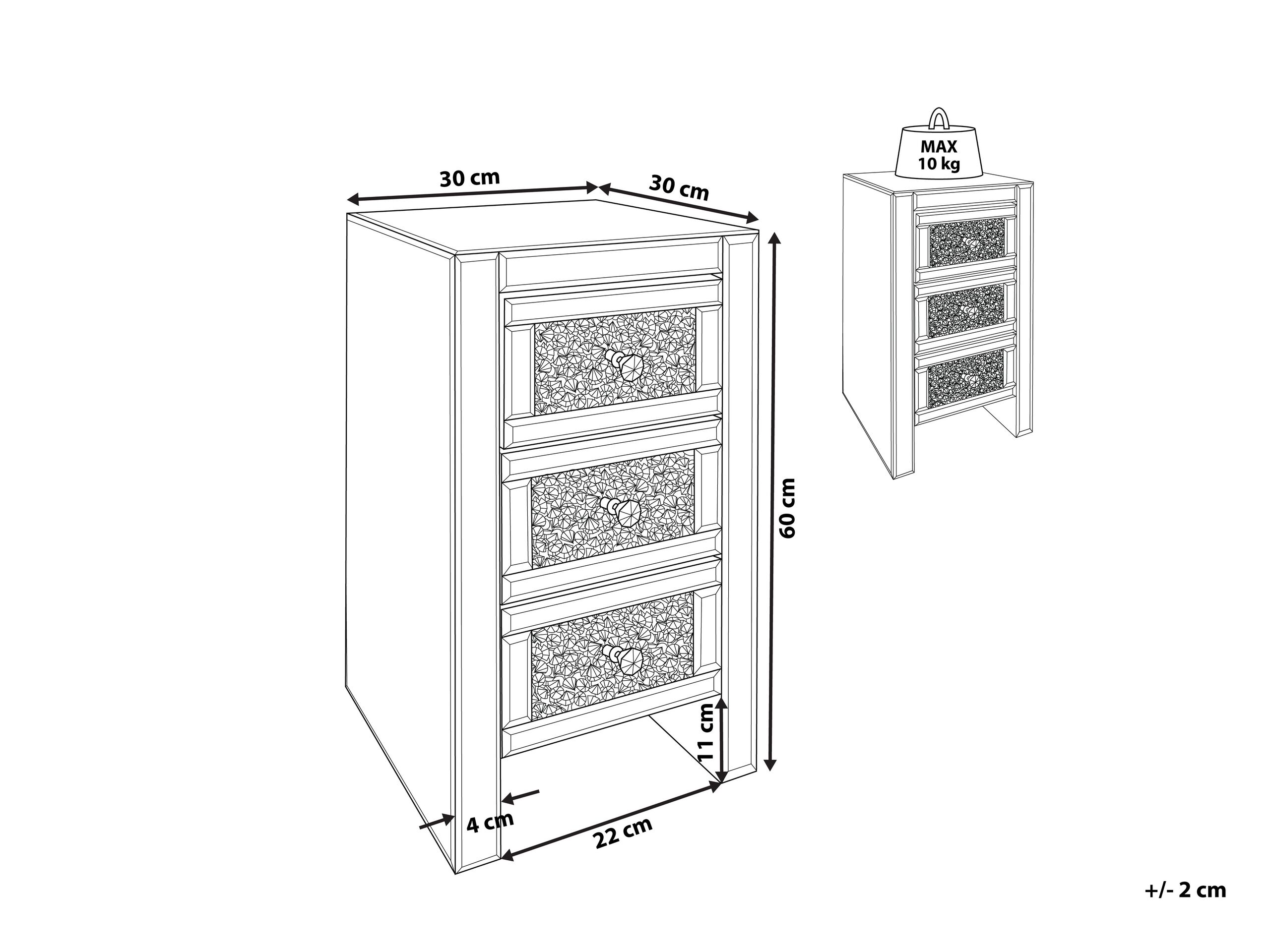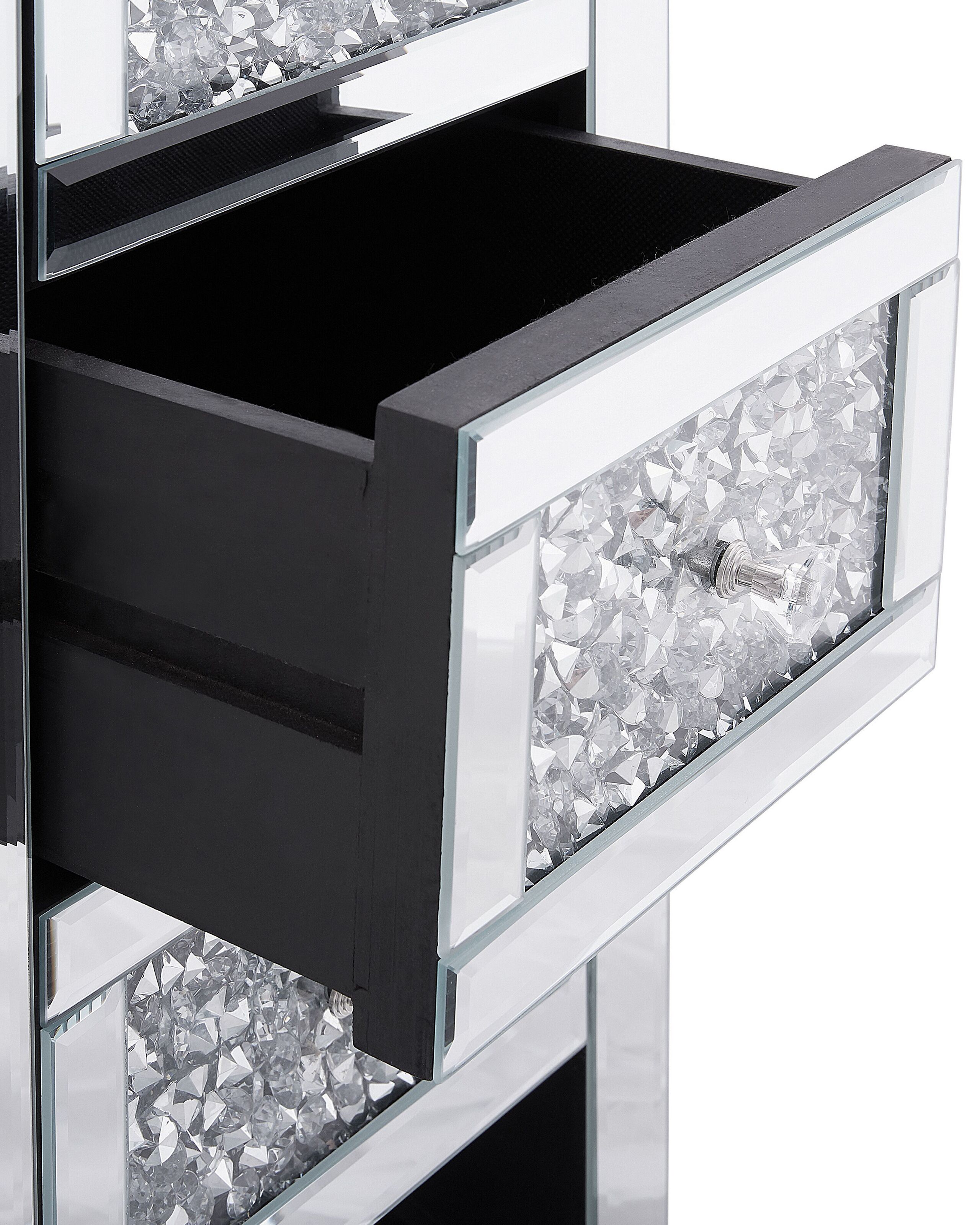 Table de nuit au style glamour avec miroir et faux diamants broyés. Cette commode à miroir glamour est un complément parfait à tout intérieur de style glamour. Dotée de trois tiroirs avec mécanisme de fermeture en douceur, elle vous aidera à garder votre salon ou votre chambre bien rangée. Les boutons en cristal brillant et les façades étincelantes en font une décoration qui attire le regard.