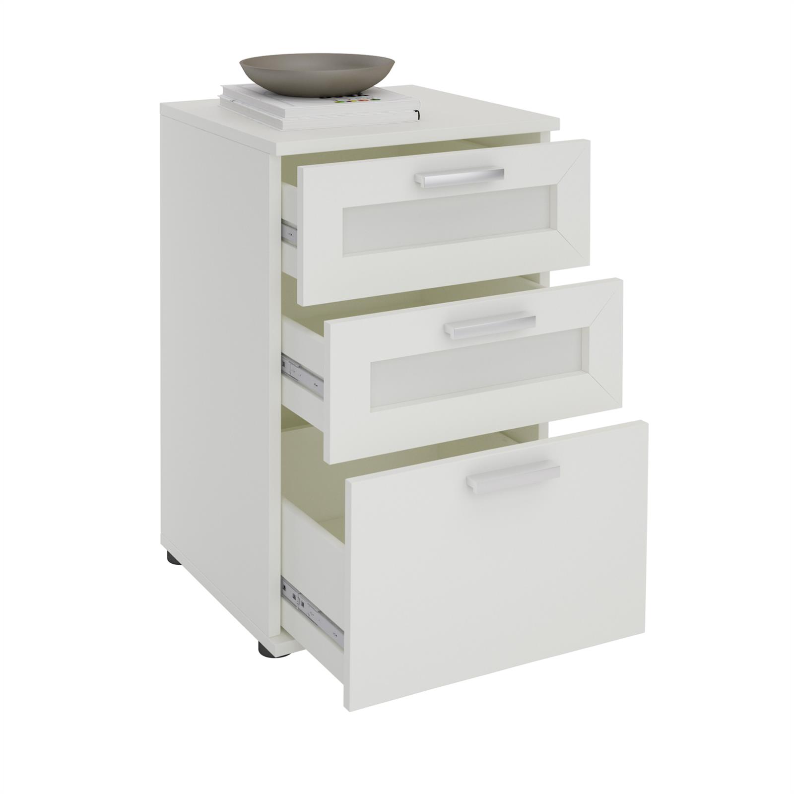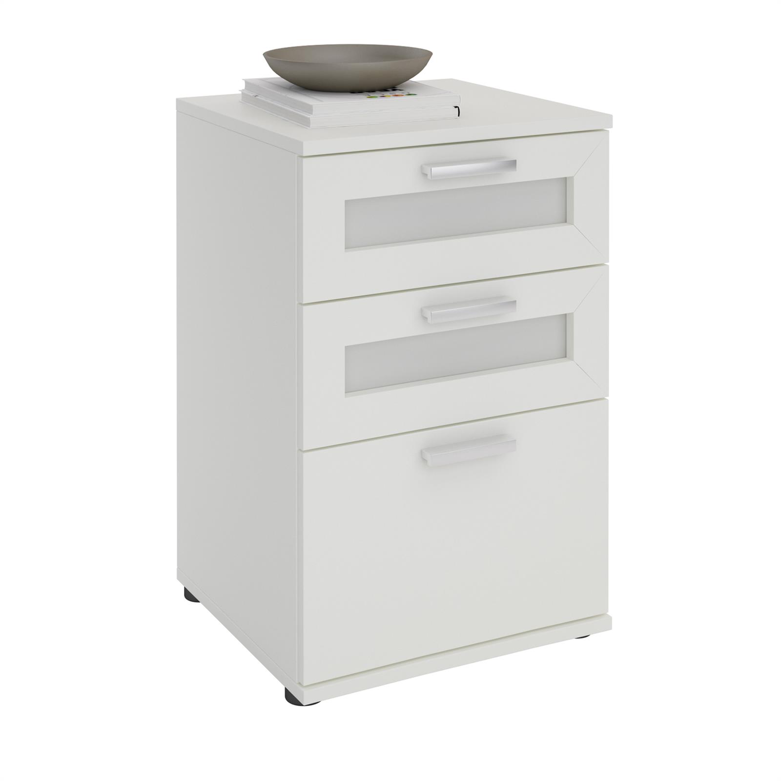 | Libellé | Table de chevet JESSY, table de nuit hauteur 60 cm avec 3 tiroirs 2 inserts vitrés, pour lit boxspring, en mélaminé blanc mat |
