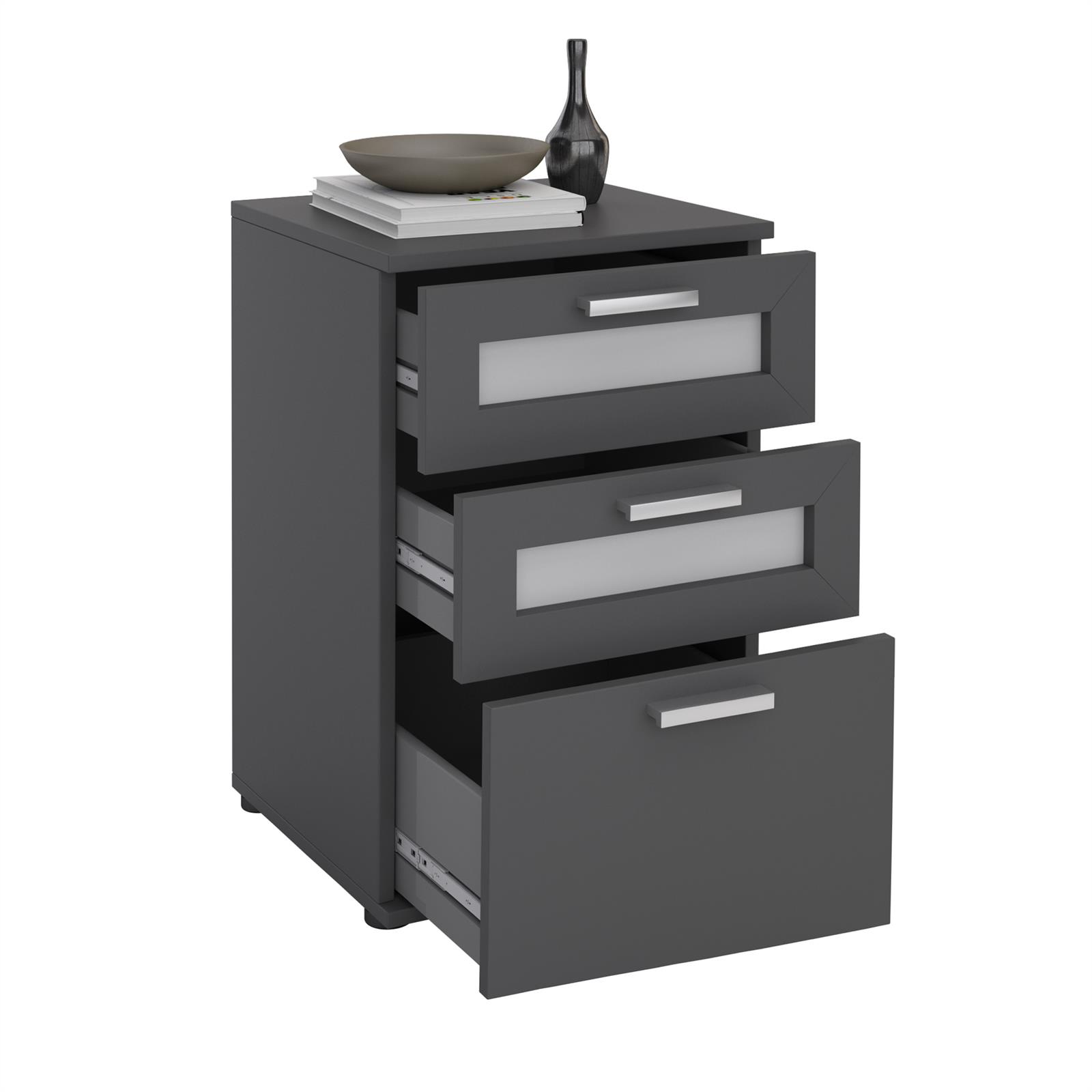 | Libellé | Table de chevet JESSY, table de nuit hauteur 60 cm avec 3 tiroirs 2 inserts vitrés, pour lit boxspring, en mélaminé gris mat |