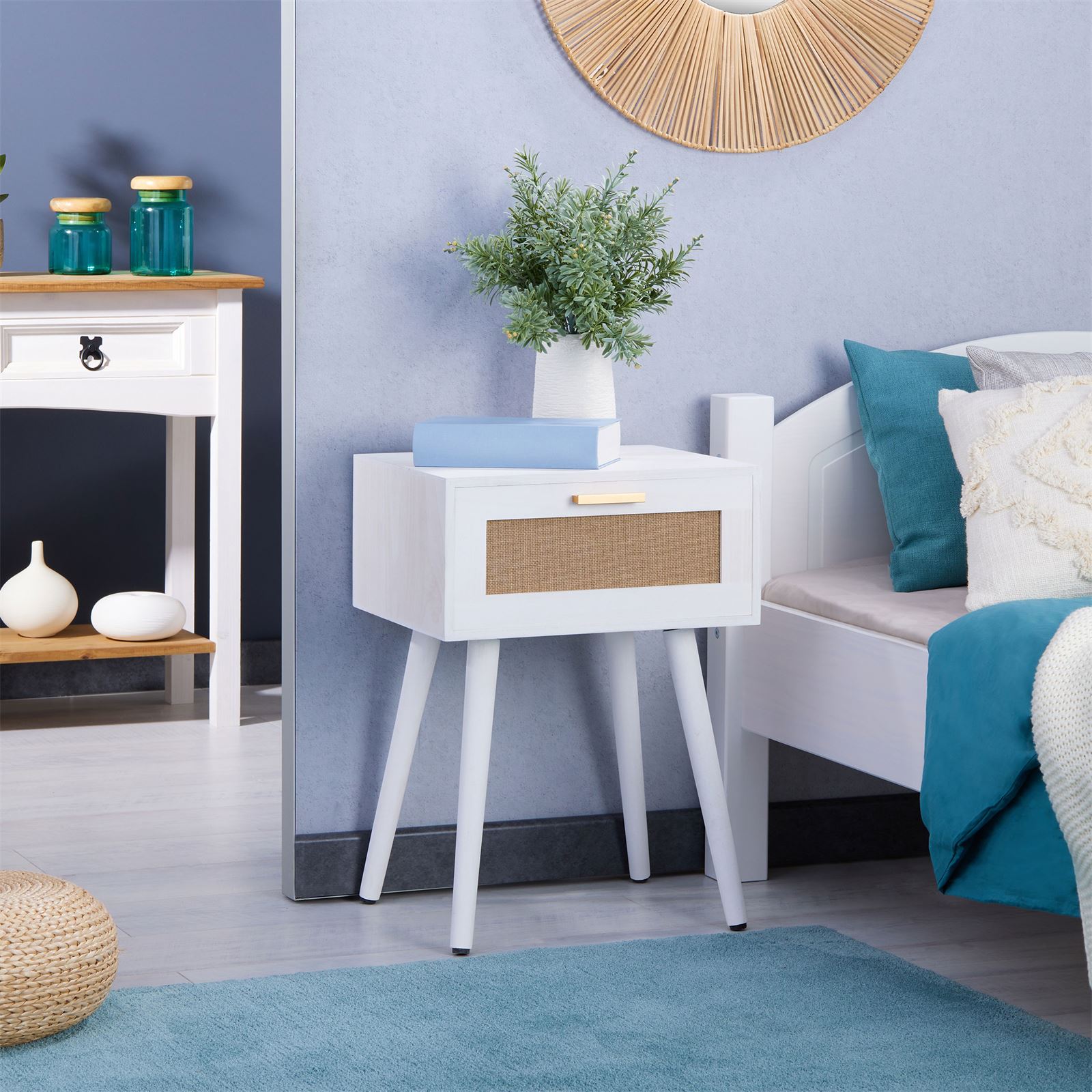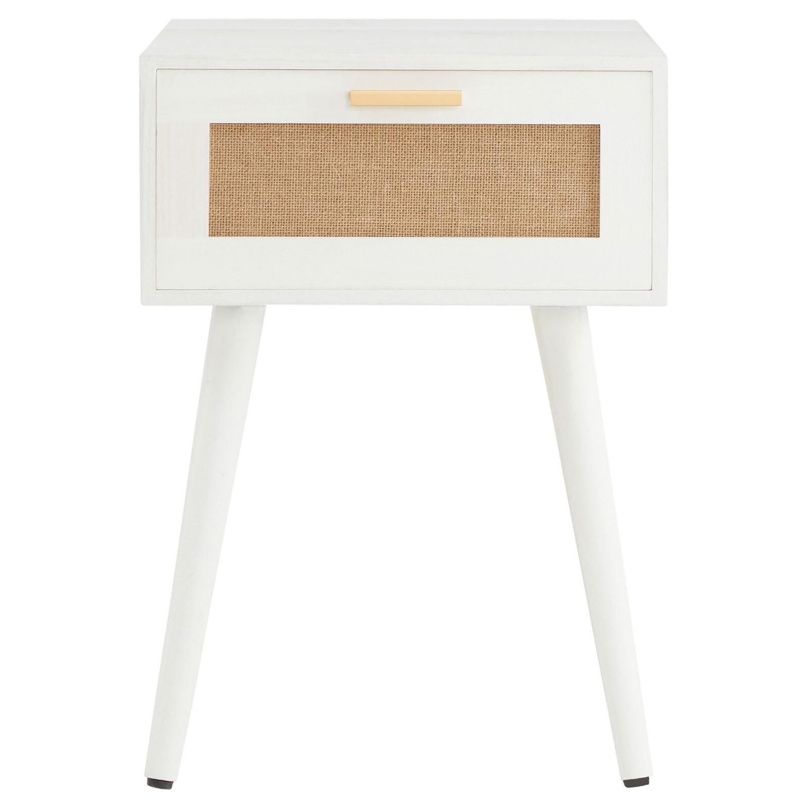 Table de chevet KIRAN 1 tiroir, table de nuit design vintage en bois blanc et lin