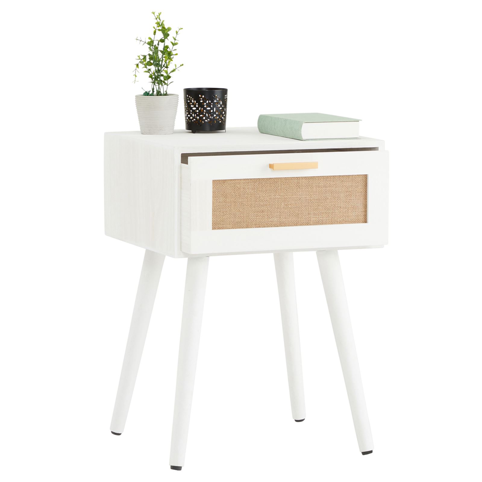| Libellé | Table de chevet KIRAN 1 tiroir, table de nuit design vintage en bois blanc et lin |