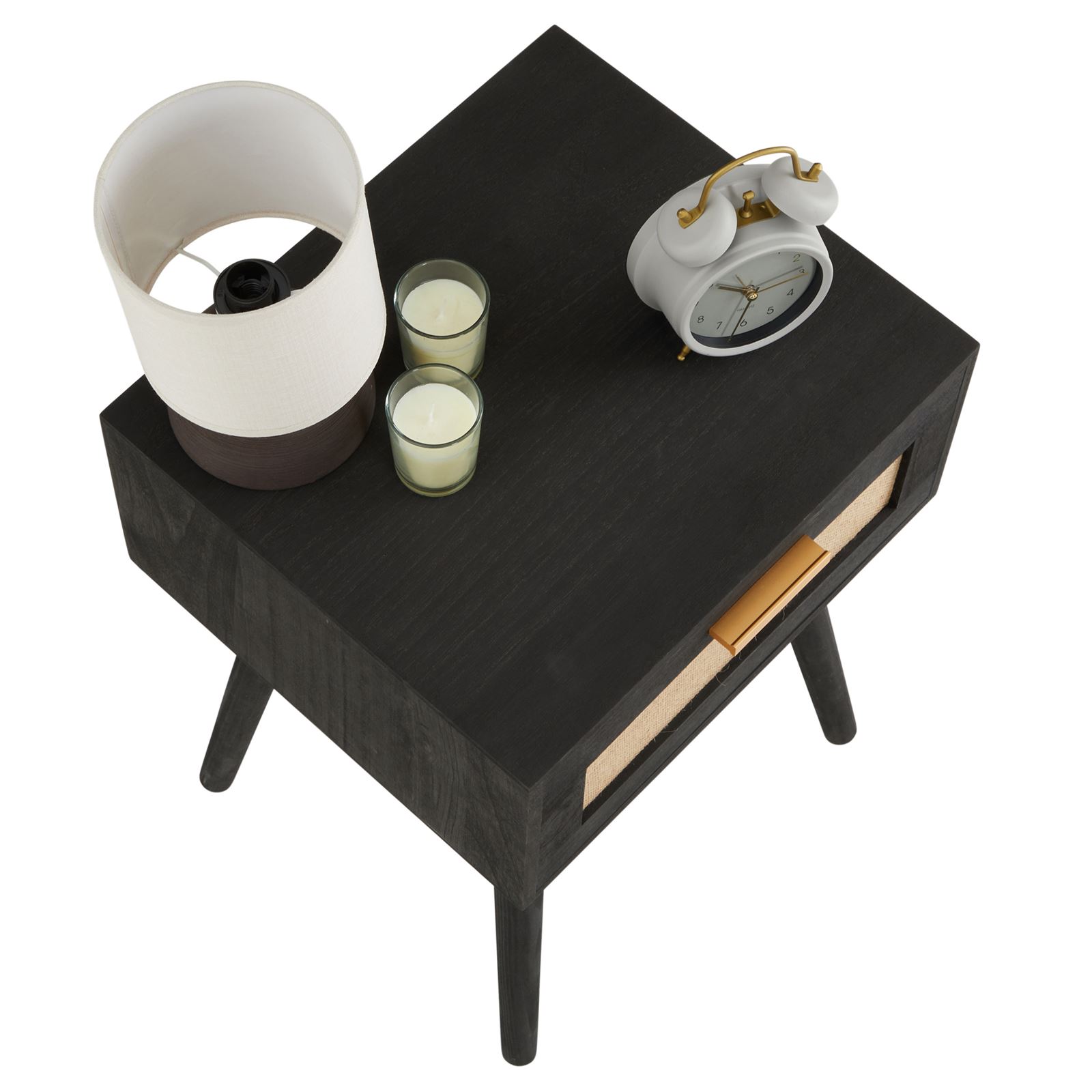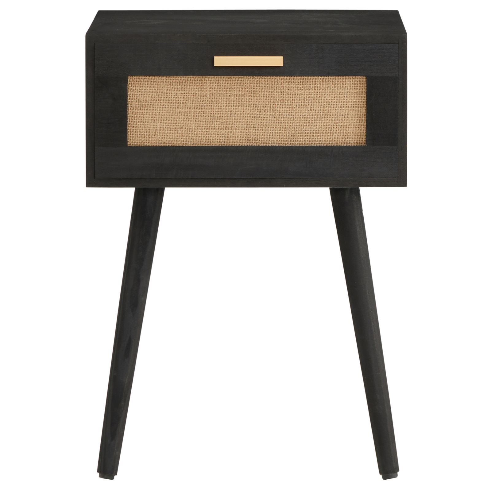 Table de chevet KIRAN 1 tiroir, table de nuit design vintage en bois lasuré noir et lin