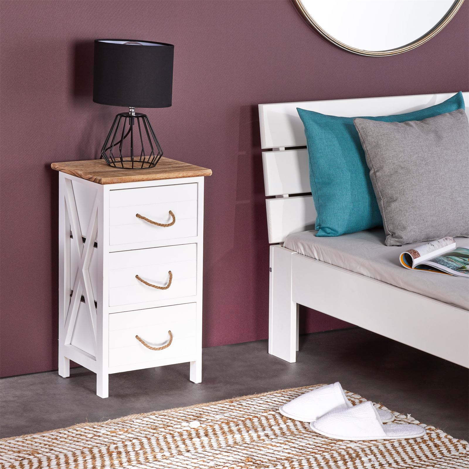 ... ne passera pas inaperçue avec son style shabby chic dans votre chambre à coucher. Le style champêtre et rustique de ce chevet est souligné par les poignées des tiroirs en sisal et la découpe du meuble. Ses 3 tiroirs vous offrent suffisamment d'espace de stockage pour ranger vos affaires personnelles à portée de main, et vous pourrez placer votre lampe de chevet, réveil et livres sur le plateau supérieur au rendu naturel. Lasuré en blanc mat, ce meuble en bois s'accordera parfaitement avec le reste de votre mobilier. En raison de sa hauteur, cette table de chevet est également adaptée pour les lits surélevés, à sommier tapissier ou boxspring.