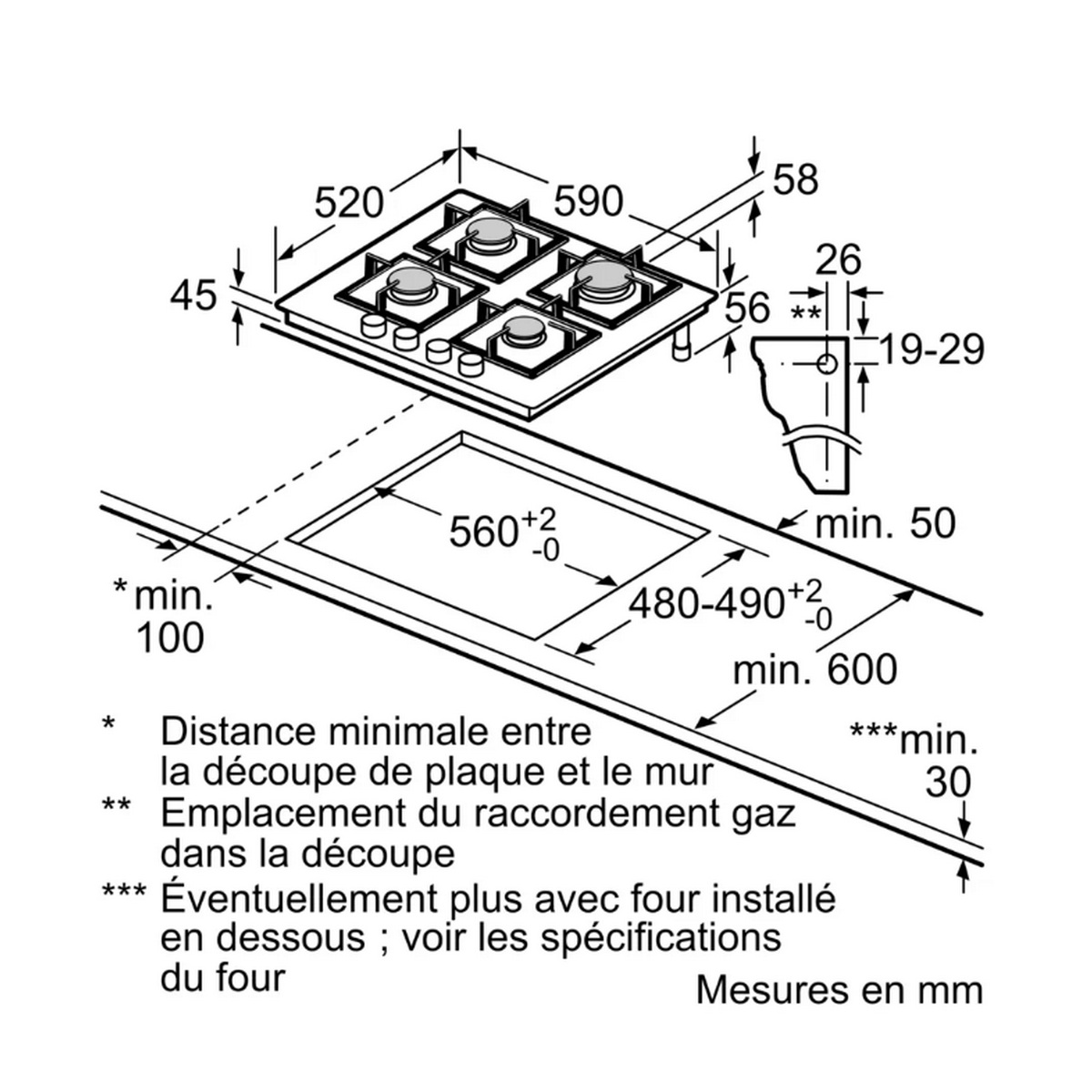 Dimensions appareil H x L x P : 54 x 590 x 520 mm.