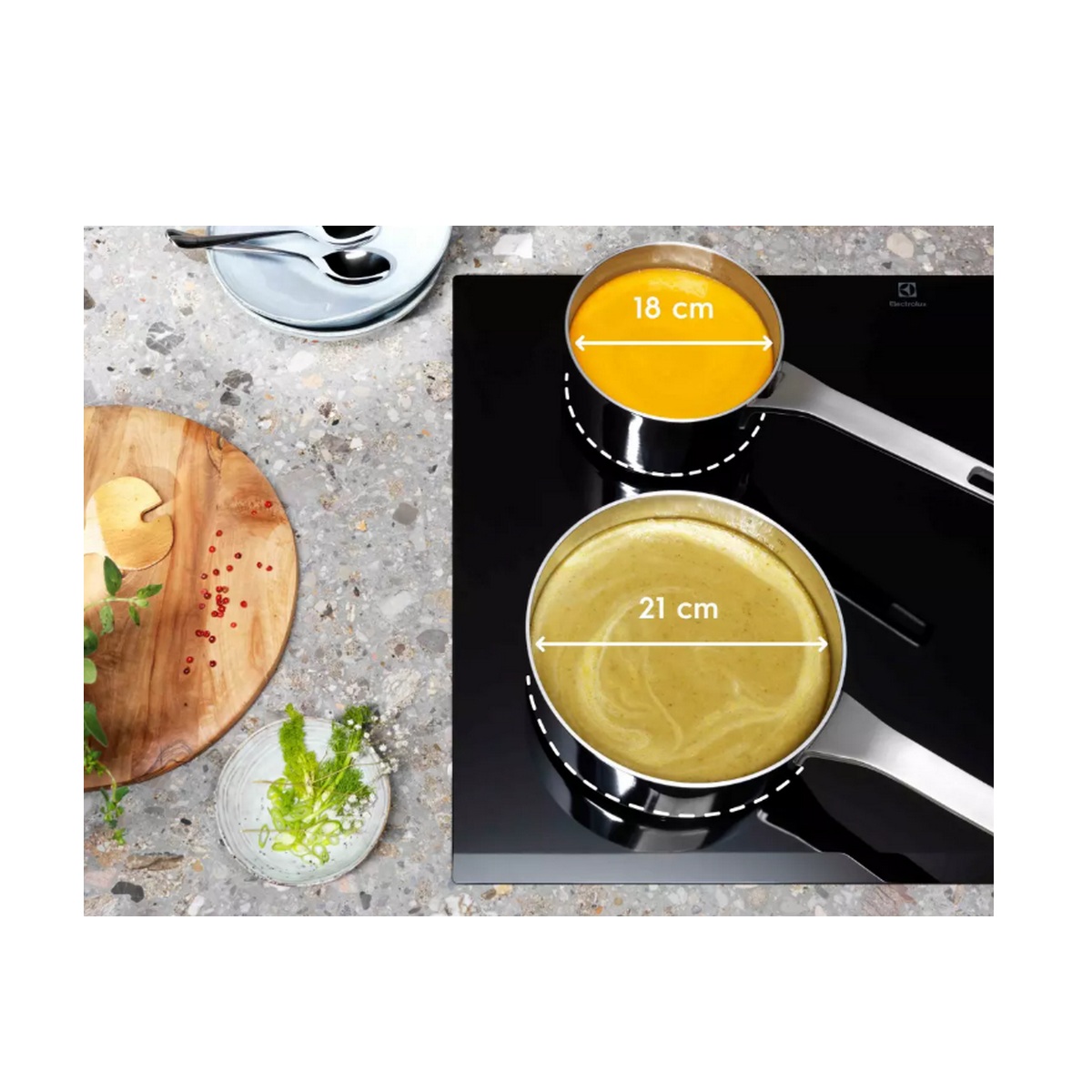 Les zones de cuisson Infinite s'adaptent à la taille de vos récipients dès que vous les posez dessus. Ces zones offrent une couverture totale, quelle que soit la taille du récipient, pour offrir la chaleur nécessaire, sans perte de performances.
