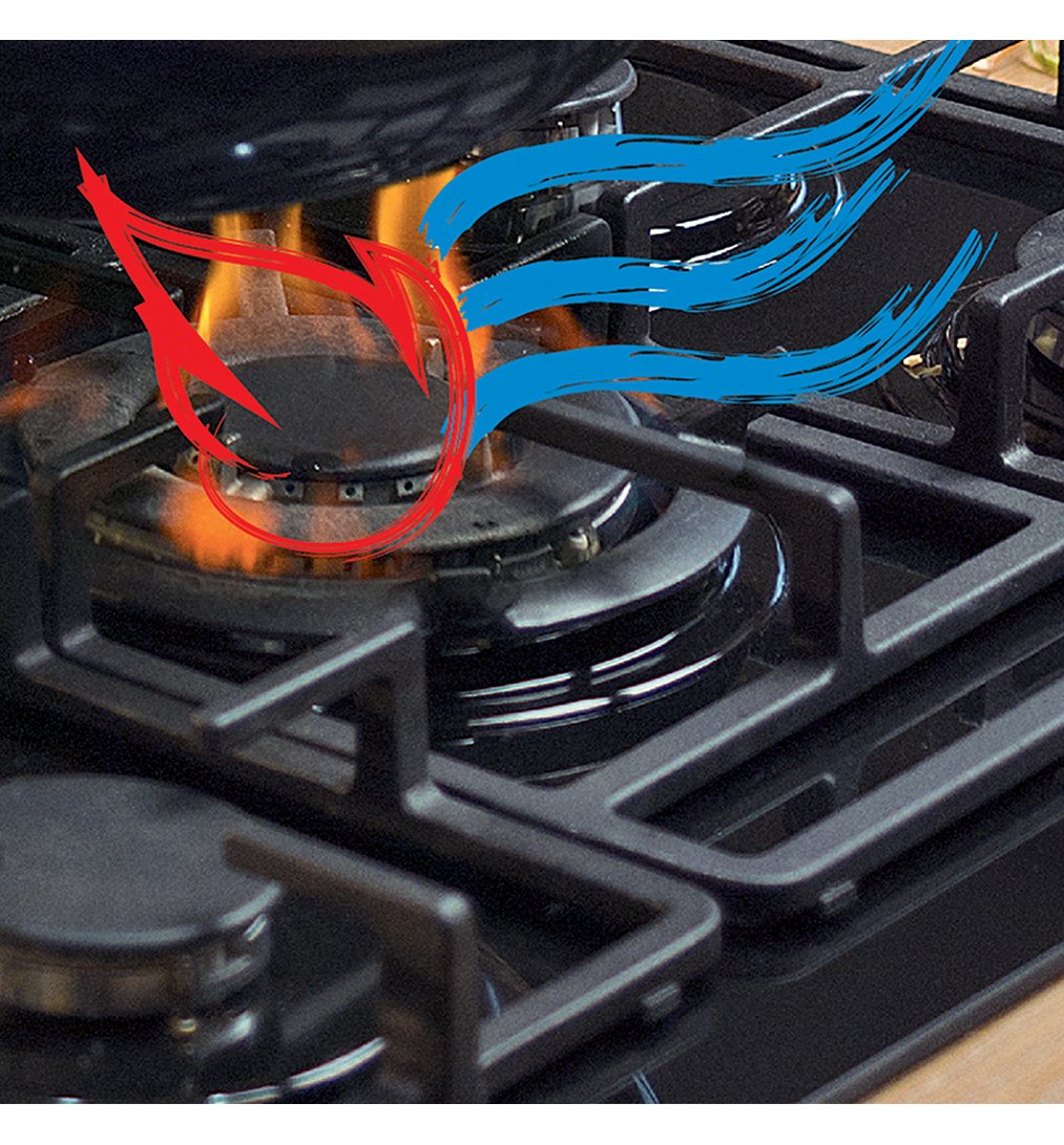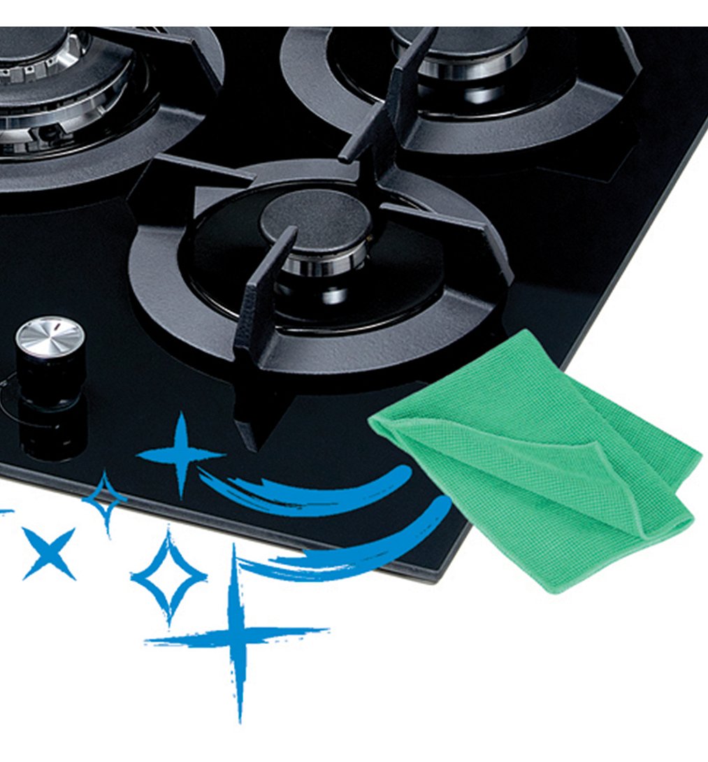 Table de cuisson 60 cm, 4 foyers gaz, allumage intégré, sécurité thermocouple, commandes frontales, verre noir