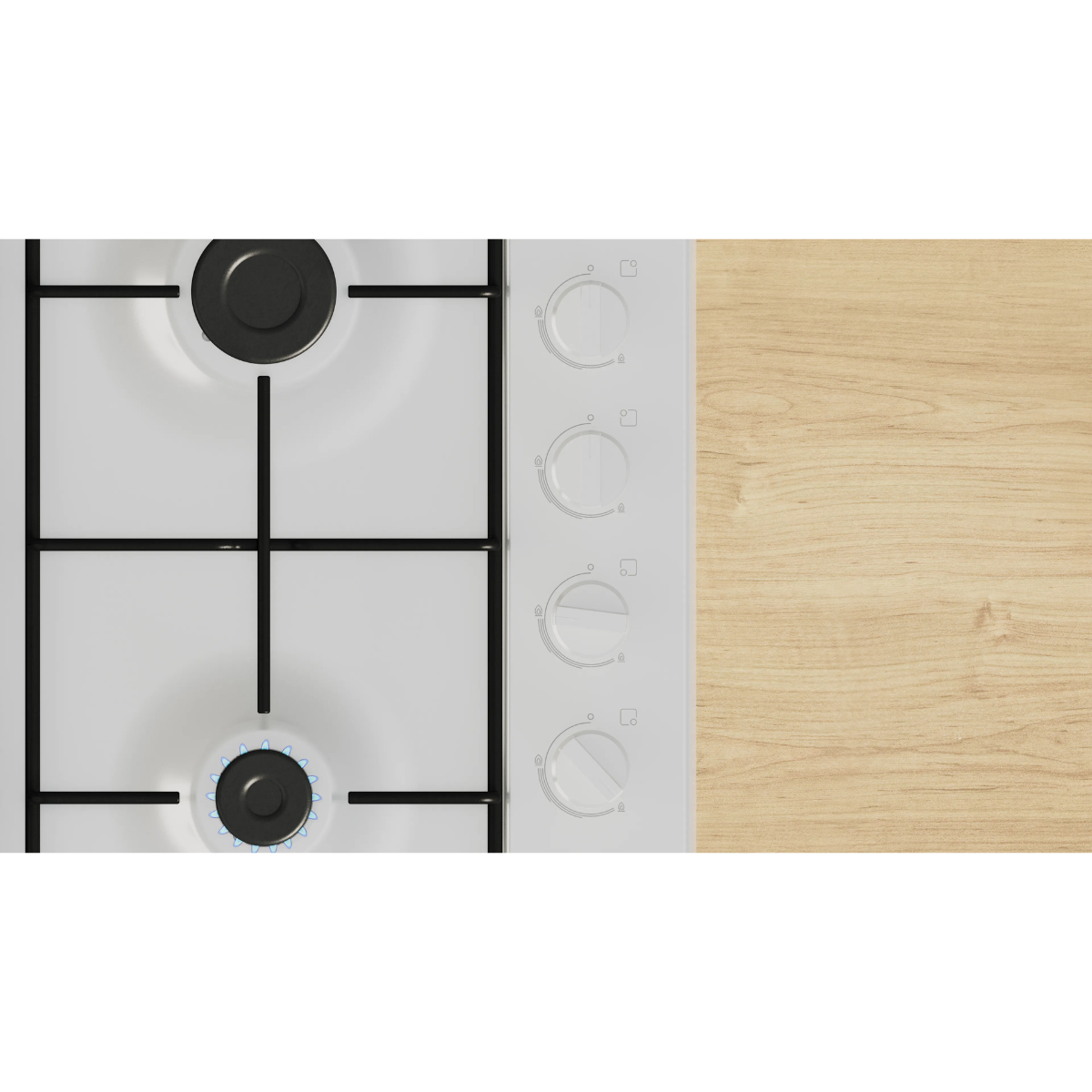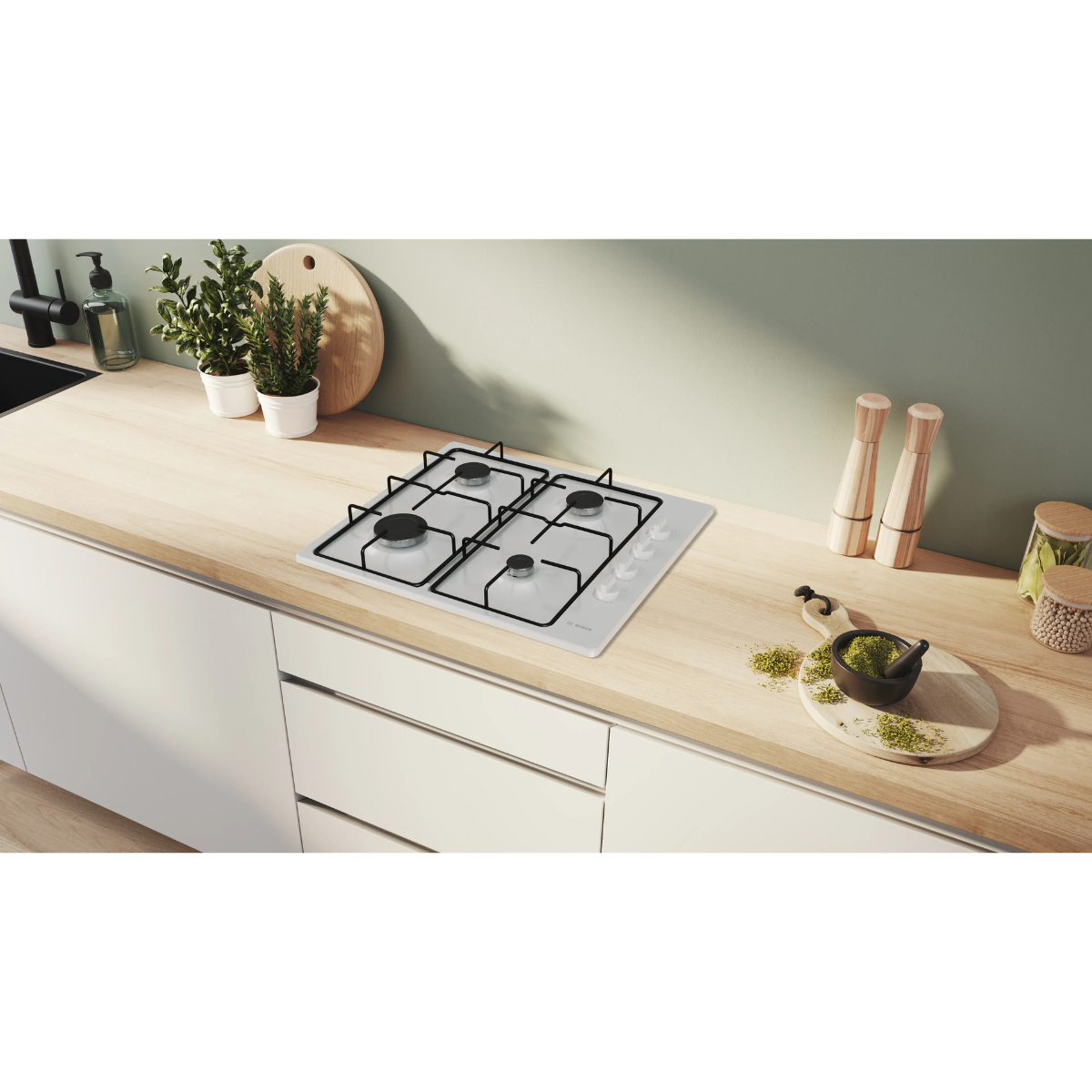 pbp6b2k80 - table de cuisson gaz 58cm 4 feux - Table gaz Série 2 PBP6B2K80 Bosch. 4 foyers dont un puissant brûleur rapide de 3 kW pour une cuisson efficace. Commandes latérales avec boutons ergonomiques offrant une bonne prise en main. Allumage électrique intégré pour un allumage facile et sécurisé. Sécurité thermocouple qui coupe automatiquement l?arrivée de gaz en cas d?extinction de la flamme. Surface en émail blanc, à la fois élégante et facile à nettoyer. Grilles émaillées robustes pour une stabilité parfaite de vos casseroles et poêles. Compatible gaz naturel et butane/propane (injecteurs fournis). Installation encastrable dans une niche standard. Compacte et performante, cette table gaz est idéale pour une cuisine pratique au quotidien.