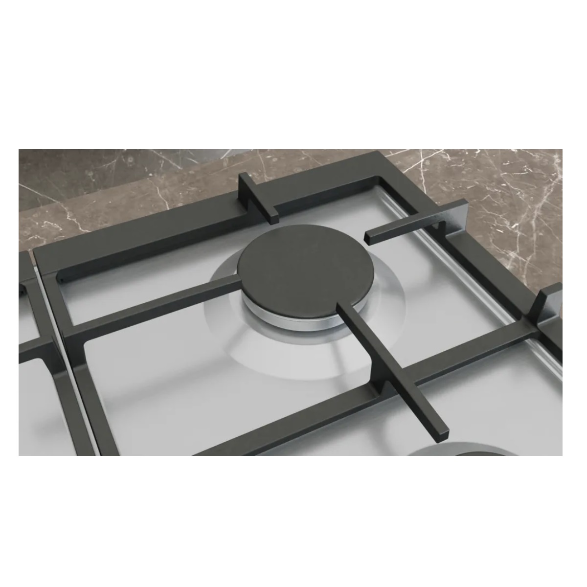 Table gaz en acier inoxydable avec technologie stepFlame pour un contrôle précis de la flamme, des boutons amovibles et supports de casseroles continus pour un nettoyage facile.