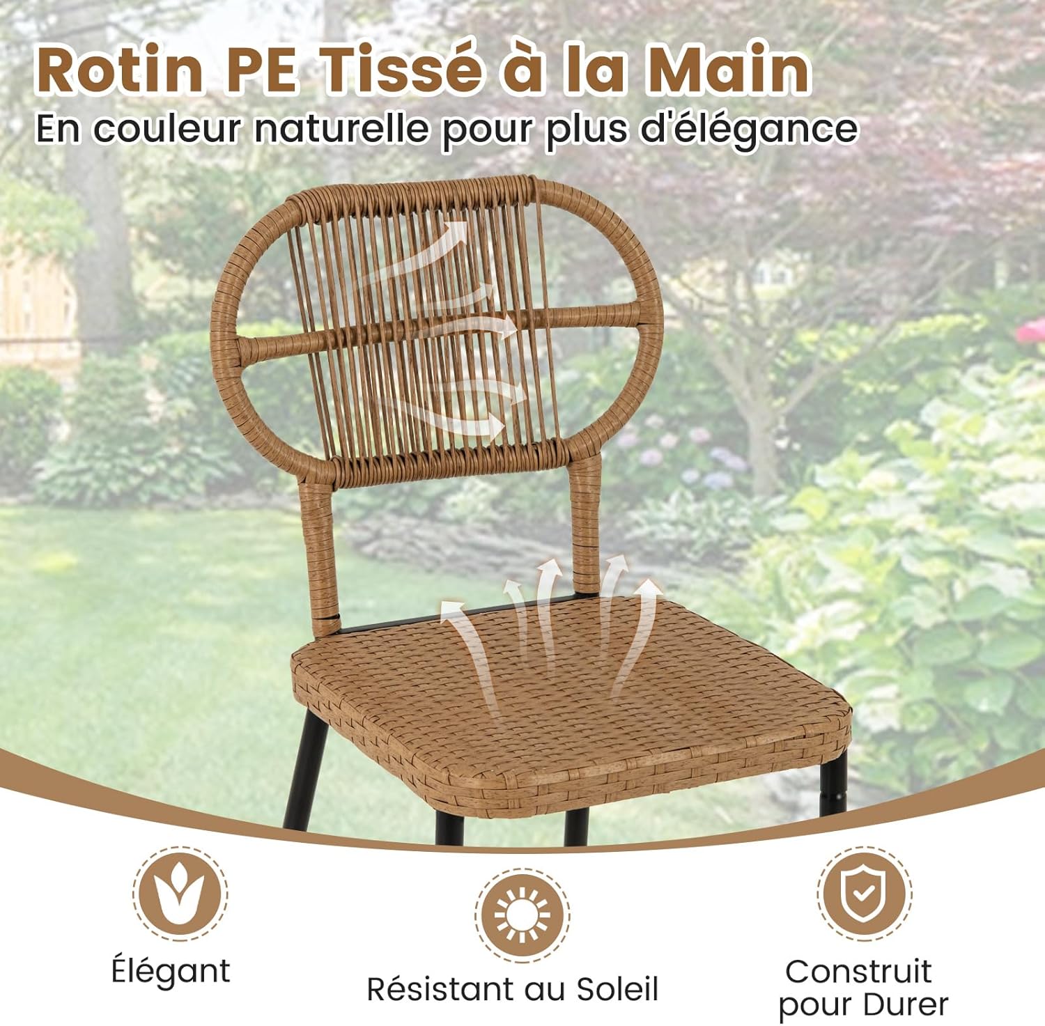 - # 𝐄𝐧𝐬𝐞𝐦𝐛𝐥𝐞 𝐝𝐞 𝟑 𝐌𝐞𝐮𝐛𝐥𝐞𝐬 𝐝𝐞 𝐉𝐚𝐫𝐝𝐢𝐧 # Cet ensemble de 3 pièces s'harmonise parfaitement avec votre décoration et comprend 2 chaises et 1 table pratique. Les chaises sont équipées de dossiers confortables pour soulager la fatigue. La table peut stocker des articles fréquemment utilisés et les garder à portée de main.