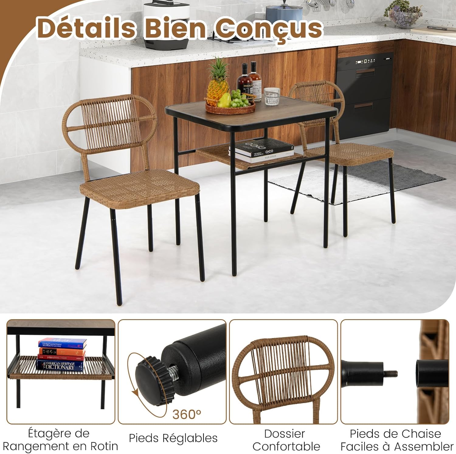 | Libellé | Table de jardin avec chaise pour 2 personnes, salon extérieur en rotin PE, dossier confortable |