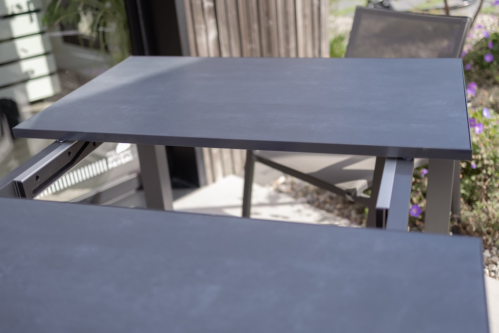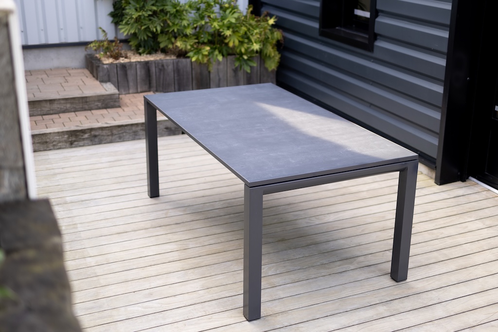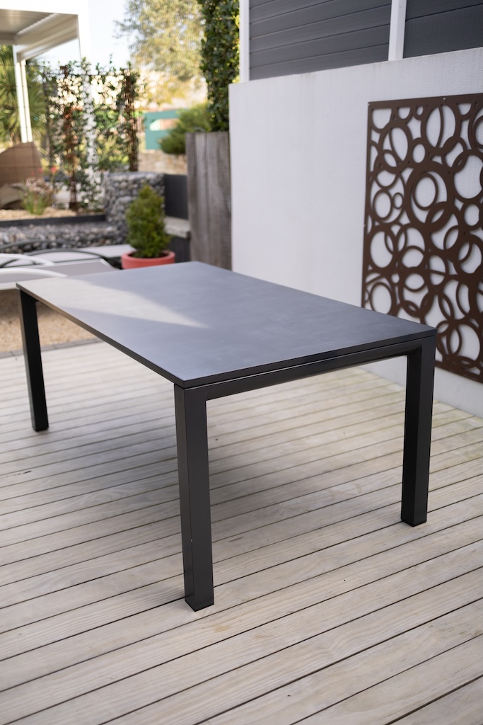 La table de jardin Cassis allie élégance et praticité pour des repas en extérieur conviviaux. Son design épuré et son plateau en verre trempé imitation pierre s’intègrent harmonieusement à tout type de terrasse. Grâce à son allonge semi-automatique, elle passe facilement de 8 à 10 places sans effort. Sa structure en aluminium garantit robustesse et durabilité face aux intempéries.
