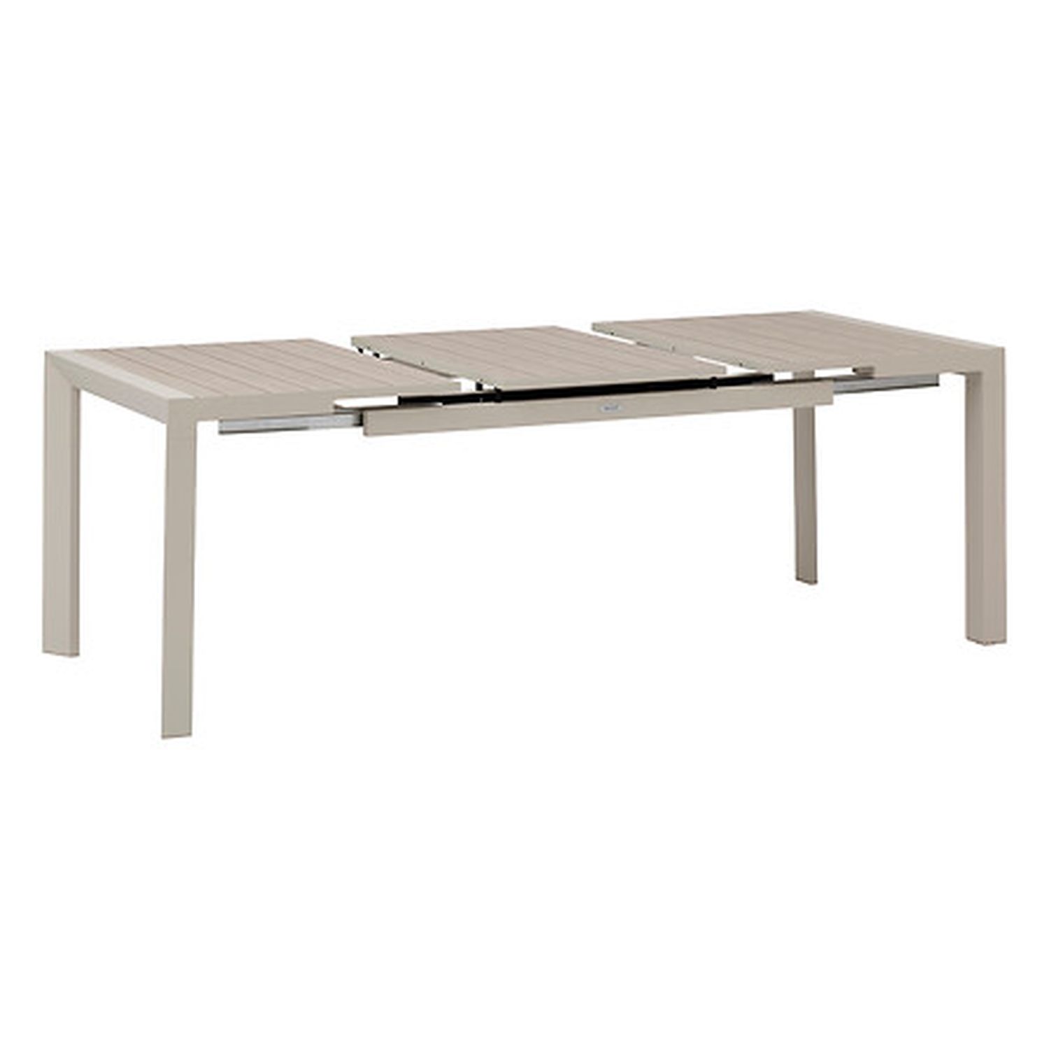 Esthétique et pratique, la table de jardin extensible ÉVASION est le meuble idéal pour organiser de belles tablées estivales ! Grâce à une rallonge automatique, la table de jardin ÉVASION s'adapte aux nombres de convives en un tour de main et permet de recevoir jusqu'à 8 personnes. Réalisée en aluminium teinté, elle offre un élégant plateau à lattes au fini effet bois et un piètement aux lignes contemporaines. Facile à accessoiriser, vous pourrez équiper cette table de chaises ou de fauteuils de jardin afin d'accueillir confortablement famille et amis tout au long de l'été ! Placez-la sous un parasol déporté ou sous une tonnelle et ajoutez des luminaires d'extérieur pour éclairer vos soirées. Traitée époxy, la structure de cette table est particulièrement résistante à la rouille et à la décoloration. Elle se nettoie avec une simple éponge savonneuse et il est recommandé de la couvrir d'une housse compatible en cas d'intempéries.