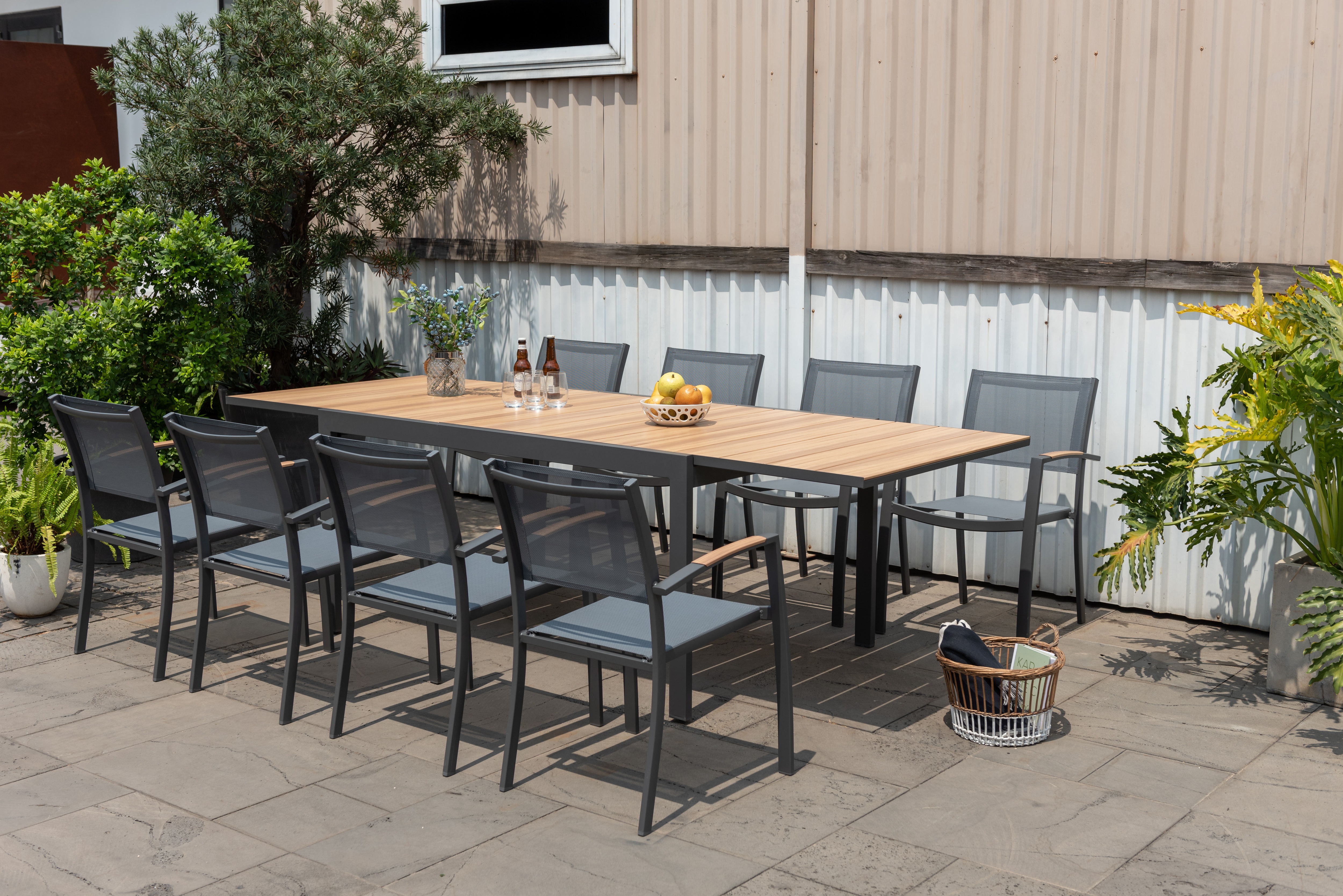Table de jardin extensible en aluminium coloris gris anthracite avec plateau imitation Teck - 10 personne