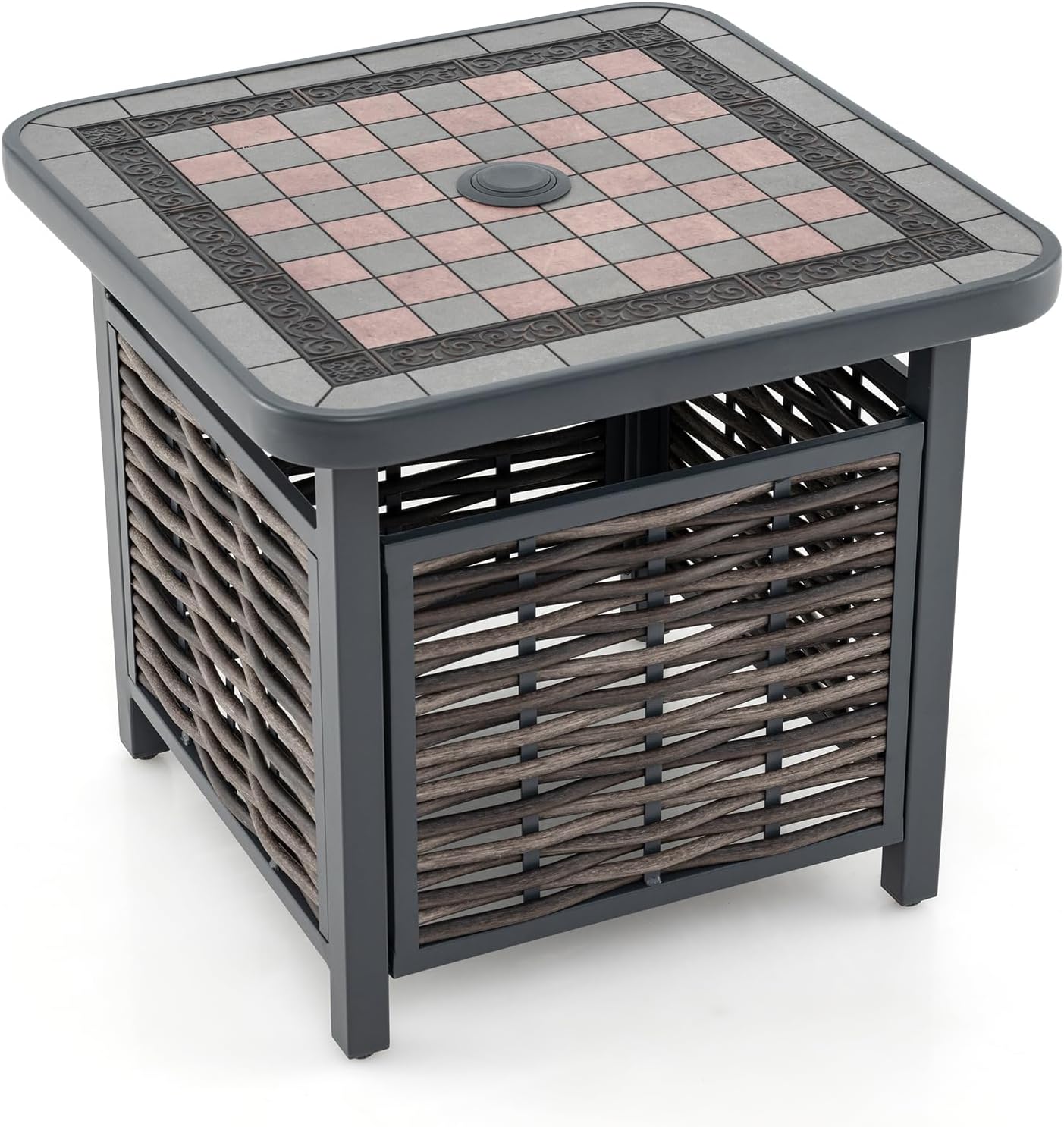 Fabriquée en rotin synthétique tressé à la main, cette table d'appoint carrée est conçue pour résister à diverses conditions extérieures. Le plateau en résine présente un motif en damier unique, offrant une surface chic et pratique pour les boissons, les collations et plus encore. Le trou de parasol intégré vous permet de profiter de l'ombre les jours ensoleillés. Son cadre en métal robuste, associé à des patins réglables, assure une stabilité globale. Cette élégante table d'appoint allie harmonieusement style et fonctionnalité, parfaite pour votre jardin, balcon ou terrasse.